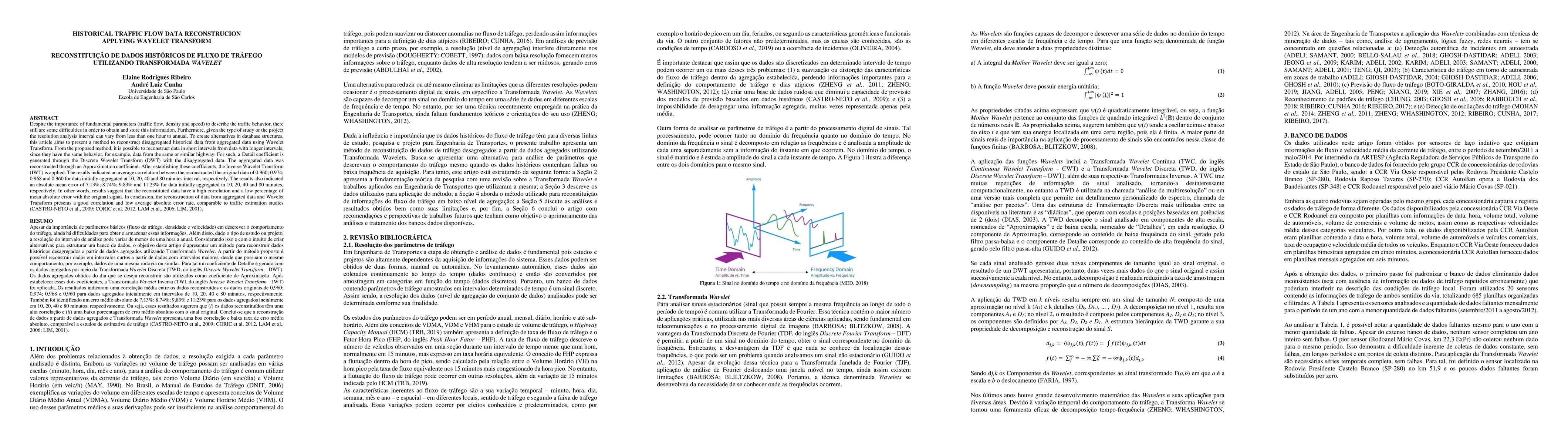 Despite the importance of fundamental parameters (traffic flow, density and speed) to describe the traffic behavior, there still are some difficulties in order to obtain and store this information. Furthermore, given the type of study or the project the resolution analysis interval can vary from less than one hour to annual. To create alternatives in database structures,this article aims to present a method to reconstruct disaggregated historical data from aggregated data using Wavelet Transform. From the proposed method, it is possible to reconstruct data in short intervals from data with longer intervals,since they have the same behavior, for example, data from the same or similar highway. For such, a Detail coefficient is generated through the Discrete Wavelet Transform (DWT) with the disaggregated data. The aggregated data was reconstructed through an Approximation coefficient. After establishing these coefficients, the Inverse Wavelet Transform (IWT) is applied. The results indicated an average correlation between the reconstructed the original data of 0.960; 0.974; 0.968 and 0.960 for data initially aggregated at 10, 20, 40 and 80 minutes interval, respectively. The results also indicated an absolute mean error of 7.13%; 8.74%; 9.83% and 11.23% for data initially aggregated in 10, 20, 40 and 80 minutes, respectively. In other words, results suggest that the reconstituted data have a high correlation and a low percentage of mean absolute error with the original signal. In conclusion, the reconstruction of data from aggregated data and Wavelet Transform presents a good correlation and low average absolute error rate, comparable to traffic estimation studies (CASTRO-NETO et al., 2009; CORIC et al. 2012, LAM et al., 2006; LIM, 2001).