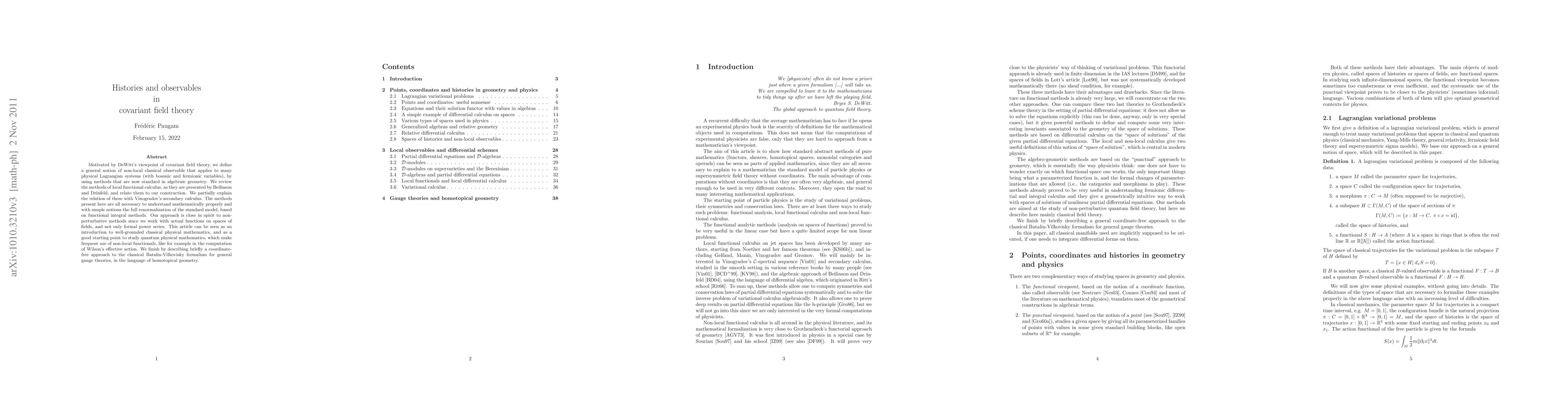 Motivated by DeWitt's viewpoint of covariant field theory, we define a general notion of non-local classical observable that applies to many physical lagrangian systems (with bosonic and fermionic variables), by using methods that are now standard in algebraic geometry. We review the (standard) methods of local functional calculus, as they are presented by Beilinson and Drinfeld, and relate them to our construction. We partially explain the relation of these with the Vinogradov's secondary calculus. The methods present here are all necessary to understand mathematically properly and with simple notions the full renormalization of the standard model, based on functional integral methods. This article can be seen as an introduction to well grounded classical physical mathematics, and as a good starting point to study quantum physical mathematics, that make frequent use of non-local functionals, like for example in the computation of Wilson's effective action. We finish by describing briefly a coordinate free approach to the classical Batalin-Vilkovisky formalism for general gauge theories, in the language of homotopical geometry.
