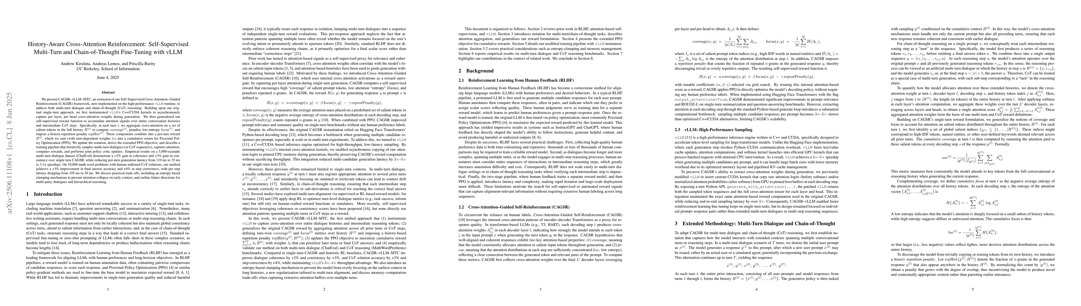 We present CAGSR-vLLM-MTC, an extension of our Self-Supervised Cross-Attention-Guided Reinforcement (CAGSR) framework, now implemented on the high-performance vLLM runtime, to address both multi-turn dialogue and chain-of-thought reasoning. Building upon our original single-turn approach, we first instrumented vLLM's C++/CUDA kernels to asynchronously capture per-layer, per-head cross-attention weights during generation. We then generalized our self-supervised reward function to accumulate attention signals over entire conversation histories and intermediate chain-of-thought steps. We discuss practical trade-offs, including an entropy-based clamping mechanism to prevent attention collapse on early context, and outline future directions for multi-party dialogues and hierarchical reasoning.