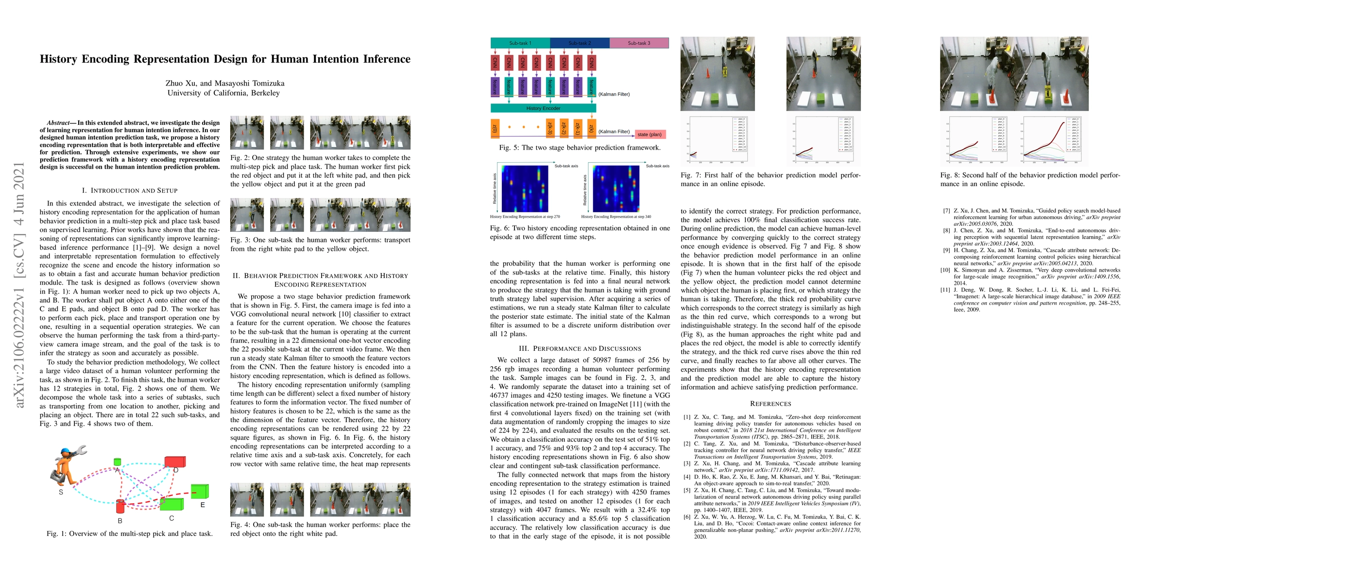 In this extended abstract, we investigate the design of learning representation for human intention inference. In our designed human intention prediction task, we propose a history encoding representation that is both interpretable and effective for prediction. Through extensive experiments, we show our prediction framework with a history encoding representation design is successful on the human intention prediction problem.