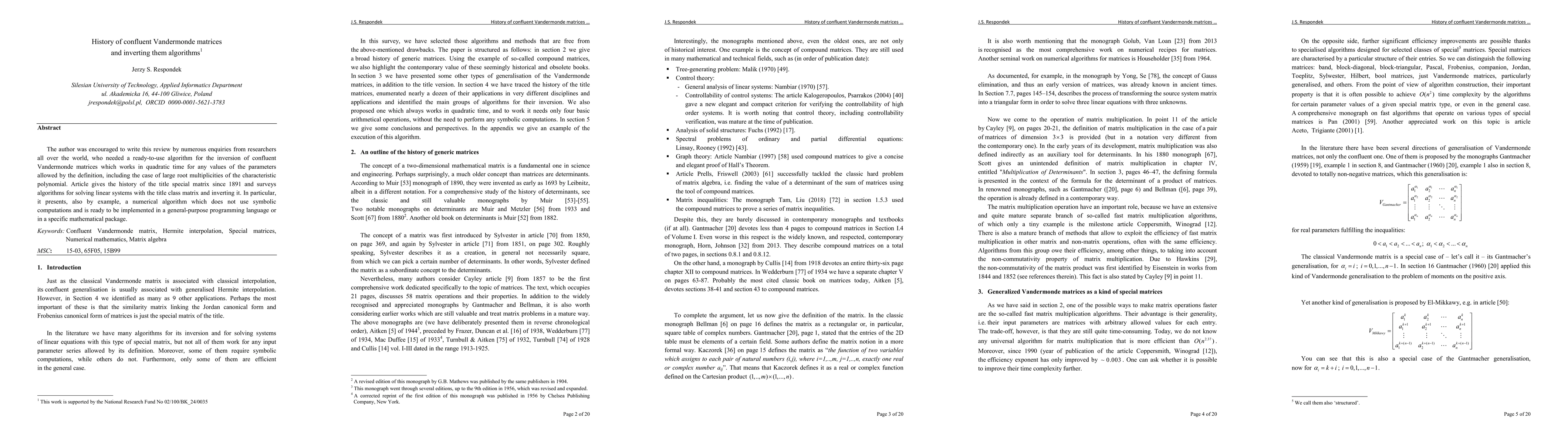 The author was encouraged to write this review by numerous enquiries from researchers all over the world, who needed a ready-to-use algorithm for the inversion of confluent Vandermonde matrices which works in quadratic time for any values of the parameters allowed by the definition, including the case of large root multiplicities of the characteristic polynomial. Article gives the history of the title special matrix since 1891 and surveys algorithms for solving linear systems with the title class matrix and inverting it. In particular, it presents, also by example, a numerical algorithm which does not use symbolic computations and is ready to be implemented in a general-purpose programming language or in a specific mathematical package.