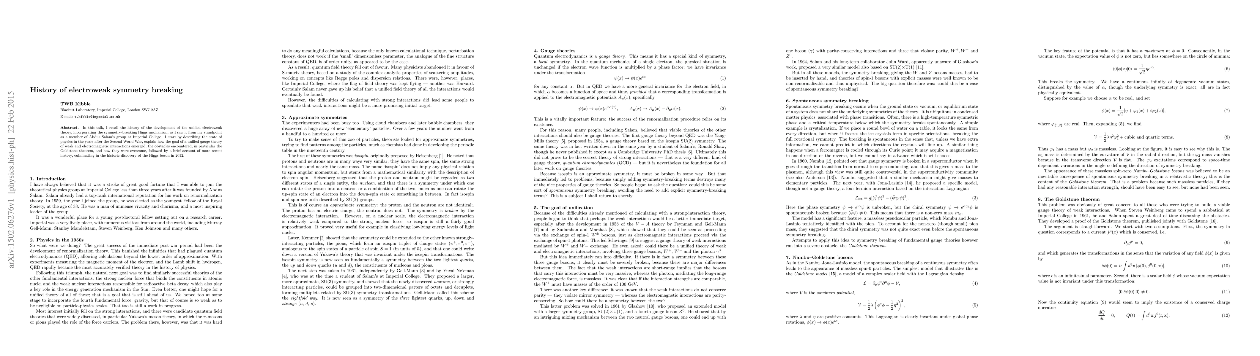 This paper recounts the history of the development of the unified electroweak theory, including the Higgs mechanism's role in symmetry breaking, from the perspective of Abdus Salam's group at Imperial College. The discovery of the Higgs boson in 2012 marks a significant milestone in this journey.