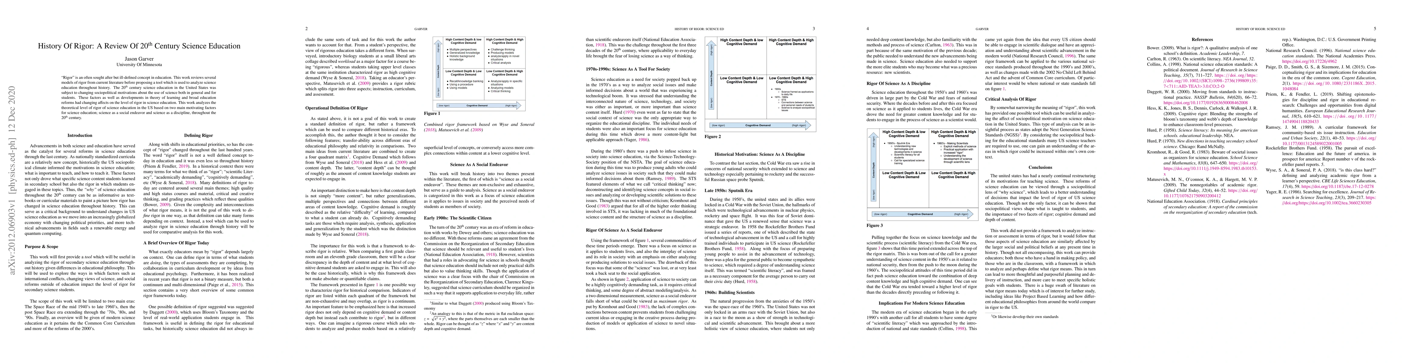 It proposes a tool to assess rigor in science education throughout history, shedding light on how changing motivations and developments impacted science education in the US during this period.