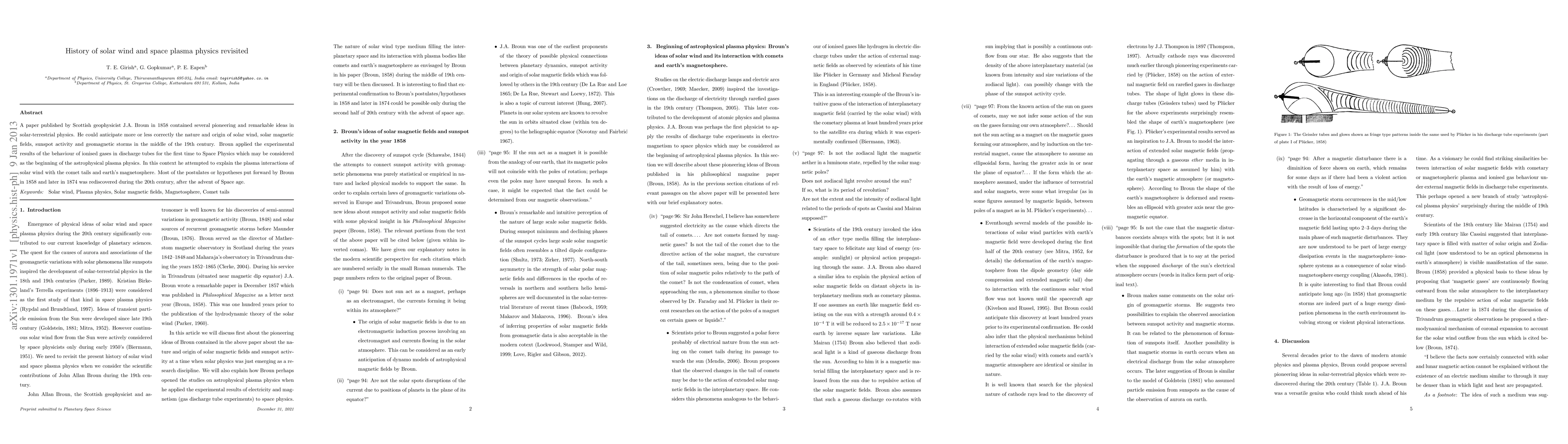 A paper published by Scottish geophysicist J.A. Broun in 1858 contained several pioneering and remarkable ideas in solar-terrestrial physics. He could anticipate more or less correctly the nature and origin of solar wind, solar magnetic fields, sunspot activity and geomagnetic storms in the middle of the 19th century. Broun applied the experimental results of the behavior of ionized gases in discharge tubes for the first time to Space Physics which may be considered as the beginning of the astrophysical plasma physics. In this context he attempted to explain the plasma interactions of solar wind with the comet tails and earth's magnetosphere. Most of the postulates or hypotheses put forward by Broun in 1858 and later in 1874 was rediscovered during the 20th century, after the advent of Space age.
