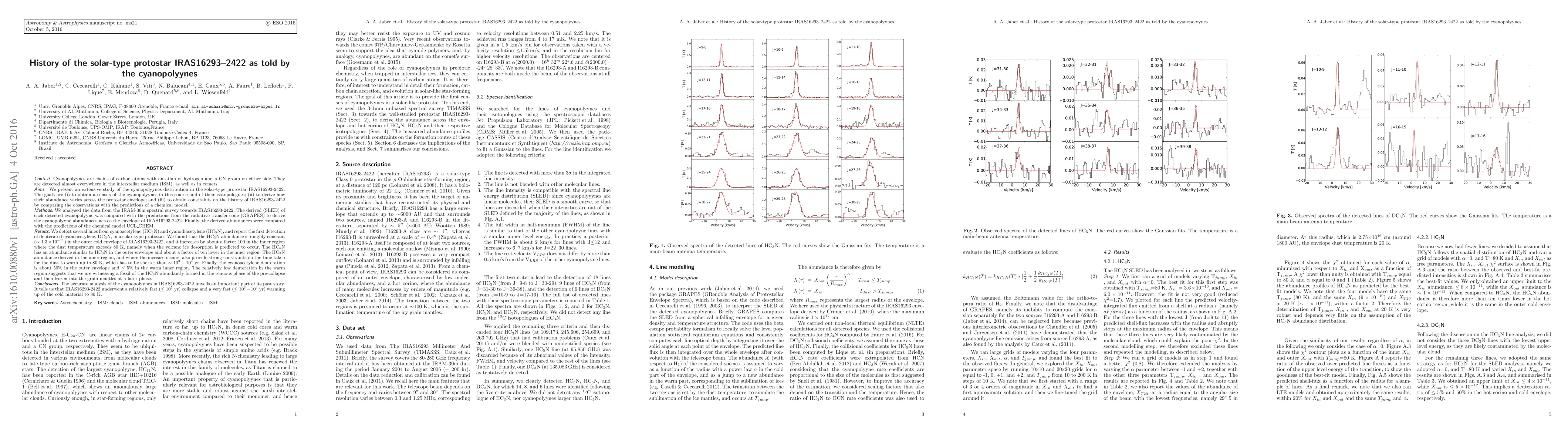 Cyanopolyynes are chains of carbon atoms with an atom of hydrogen and a CN group on either side. They are detected almost everywhere in the ISM, as well as in comets. In the past, they have been used to constrain the age of some molecular clouds, since their abundance is predicted to be a strong function of time. We present an extensive study of the cyanopolyynes distribution in the solar-type protostar IRAS16293-2422 based on TIMASSS IRAM-30m observations. The goals are (i) to obtain a census of the cyanopolyynes in this source and of their isotopologues; (ii) to derive how their abundance varies across the protostar envelope; and (iii) to obtain constraints on the history of IRAS16293-2422. We detect several lines from HC3N and HC5N, and report the first detection of DC3N, in a solar-type protostar. We found that the HC3N abundance is roughly constant (~1.3x10^(-11)) in the outer cold envelope of IRAS16293-2422, and it increases by about a factor 100 in the inner region where Tdust>80K. The HC5N has an abundance similar to HC3N in the outer envelope and about a factor of ten lower in the inner region. The HC3N abundance derived in the inner region, and where the increase occurs, also provide strong constraints on the time taken for the dust to warm up to 80K, which has to be shorter than ~10^3-10^4yr. Finally, the cyanoacetylene deuteration is about 50\% in the outer envelope and <5$\% in the warm inner region. The relatively low deuteration in the warm region suggests that we are witnessing a fossil of the HC3N abundantly formed in the tenuous phase of the pre-collapse and then frozen into the grain mantles at a later phase. The accurate analysis of the cyanopolyynes in IRAS16293-2422 unveils an important part of its past story. It tells us that IRAS16293-2422 underwent a relatively fast (<10^5yr) collapse and a very fast (<10^3-10^4yr) warming up of the cold material to 80K.
