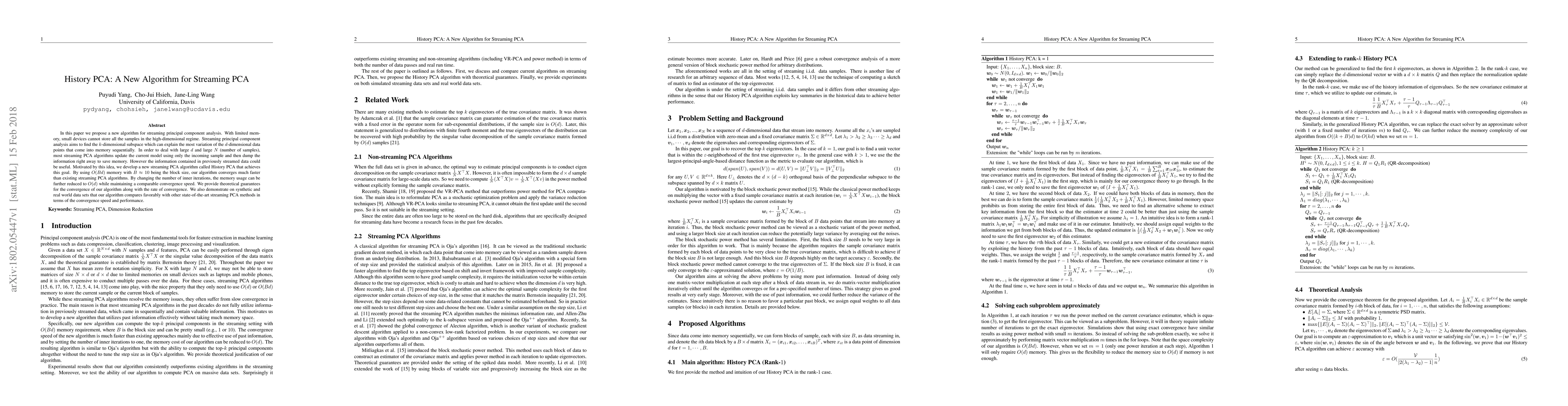 This paper introduces History PCA, a novel streaming algorithm for principal component analysis that efficiently handles high-dimensional data with limited memory. It converges faster than existing methods by leveraging information from previously streamed data, offering theoretical guarantees and outperforming other state-of-the-art techniques in both speed and performance.