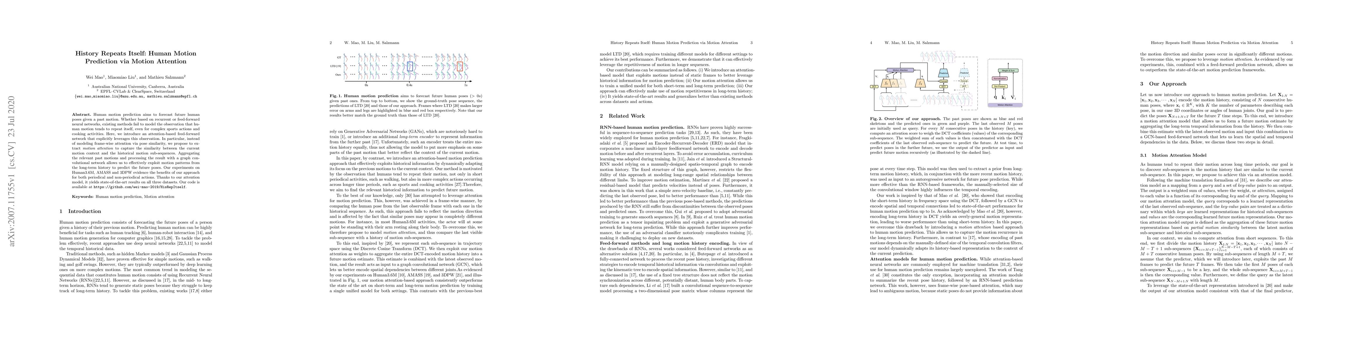 Human motion prediction aims to forecast future human poses given a past motion. Whether based on recurrent or feed-forward neural networks, existing methods fail to model the observation that human motion tends to repeat itself, even for complex sports actions and cooking activities. Here, we introduce an attention-based feed-forward network that explicitly leverages this observation. In particular, instead of modeling frame-wise attention via pose similarity, we propose to extract motion attention to capture the similarity between the current motion context and the historical motion sub-sequences. Aggregating the relevant past motions and processing the result with a graph convolutional network allows us to effectively exploit motion patterns from the long-term history to predict the future poses. Our experiments on Human3.6M, AMASS and 3DPW evidence the benefits of our approach for both periodical and non-periodical actions. Thanks to our attention model, it yields state-of-the-art results on all three datasets. Our code is available at https://github.com/wei-mao-2019/HisRepItself.