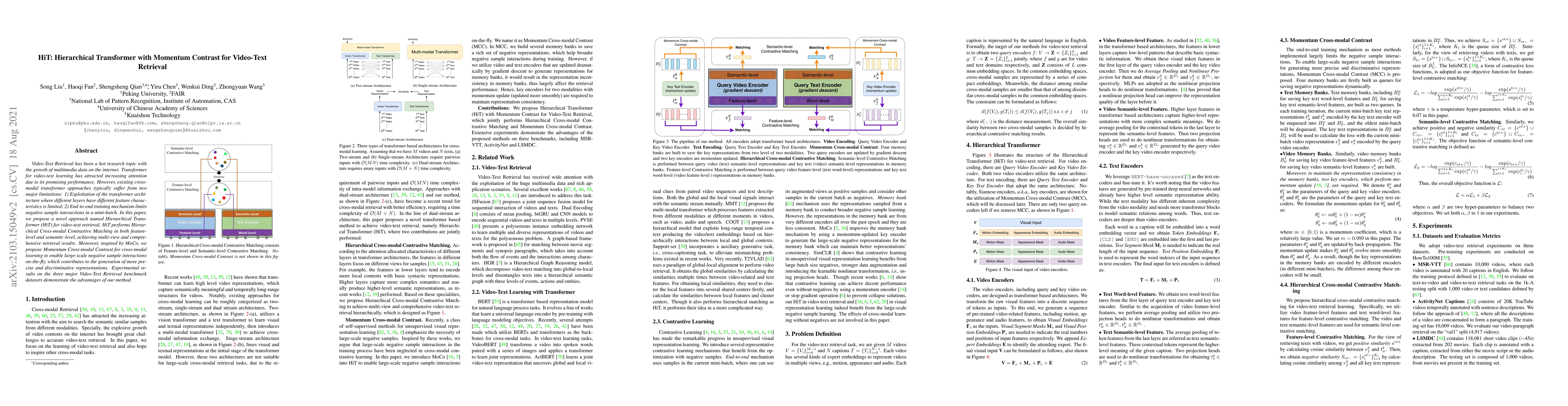 The paper proposes a Hierarchical Transformer (HiT) for video-text retrieval, addressing limitations in existing cross-modal transformer approaches by employing hierarchical contrastive matching and a Momentum Contrast mechanism to enhance representation learning. Experimental results show improved performance on major benchmark datasets.