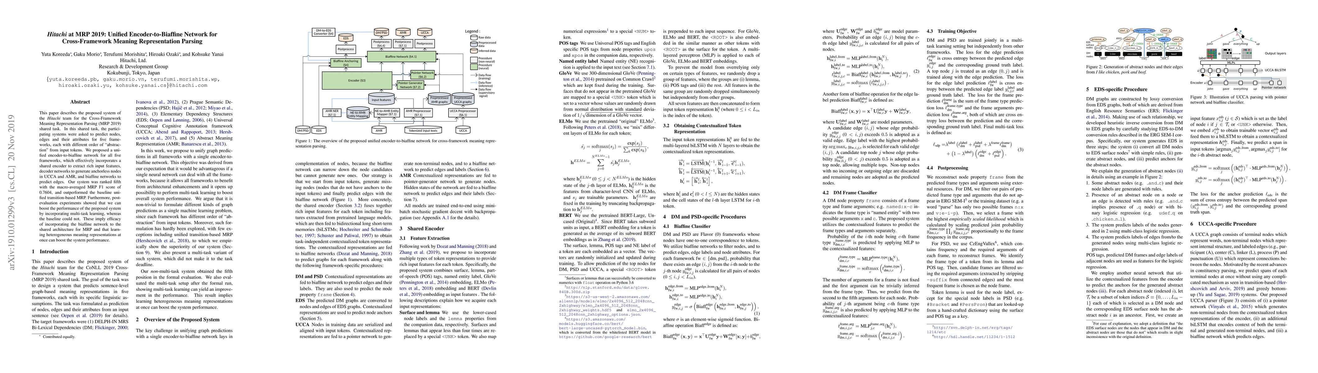 This paper describes the proposed system of the Hitachi team for the Cross-Framework Meaning Representation Parsing (MRP 2019) shared task. In this shared task, the participating systems were asked to predict nodes, edges and their attributes for five frameworks, each with different order of "abstraction" from input tokens. We proposed a unified encoder-to-biaffine network for all five frameworks, which effectively incorporates a shared encoder to extract rich input features, decoder networks to generate anchorless nodes in UCCA and AMR, and biaffine networks to predict edges. Our system was ranked fifth with the macro-averaged MRP F1 score of 0.7604, and outperformed the baseline unified transition-based MRP. Furthermore, post-evaluation experiments showed that we can boost the performance of the proposed system by incorporating multi-task learning, whereas the baseline could not. These imply efficacy of incorporating the biaffine network to the shared architecture for MRP and that learning heterogeneous meaning representations at once can boost the system performance.