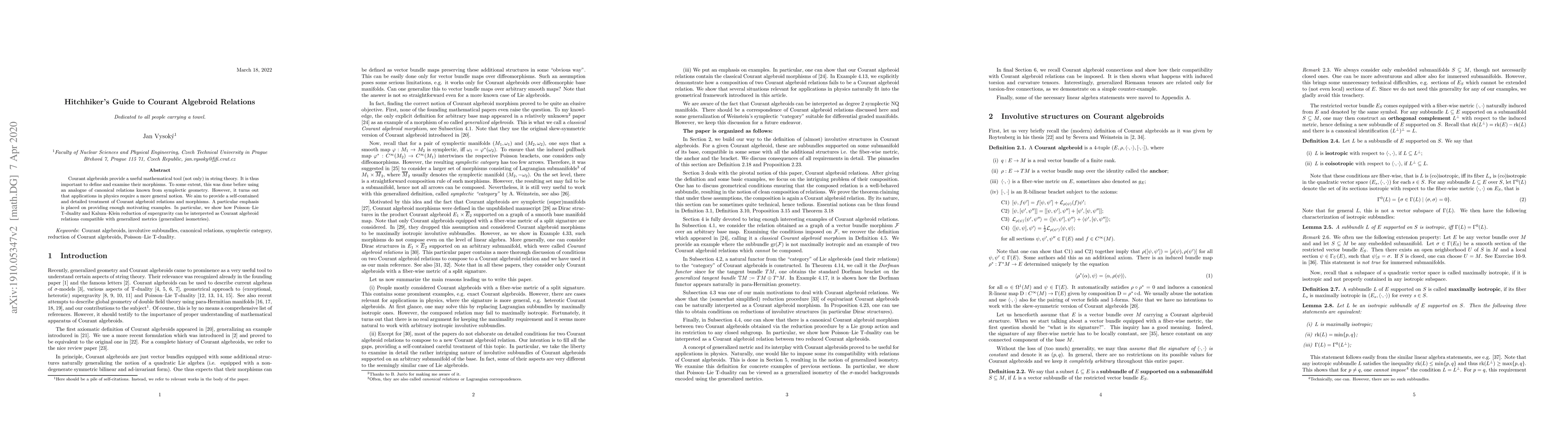 Courant algebroids provide a useful mathematical tool (not only) in string theory. It is thus important to define and examine their morphisms. To some extent, this was done before using an analogue of canonical relations known from symplectic geometry. However, it turns out that applications in physics require a more general notion. We aim to provide a self-contained and detailed treatment of Courant algebroid relations and morphisms. A particular emphasis is placed on providing enough motivating examples. In particular, we show how Poisson-Lie T-duality and Kaluza-Klein reduction of supergravity can be interpreted as Courant algebroid relations compatible with generalized metrics (generalized isometries).