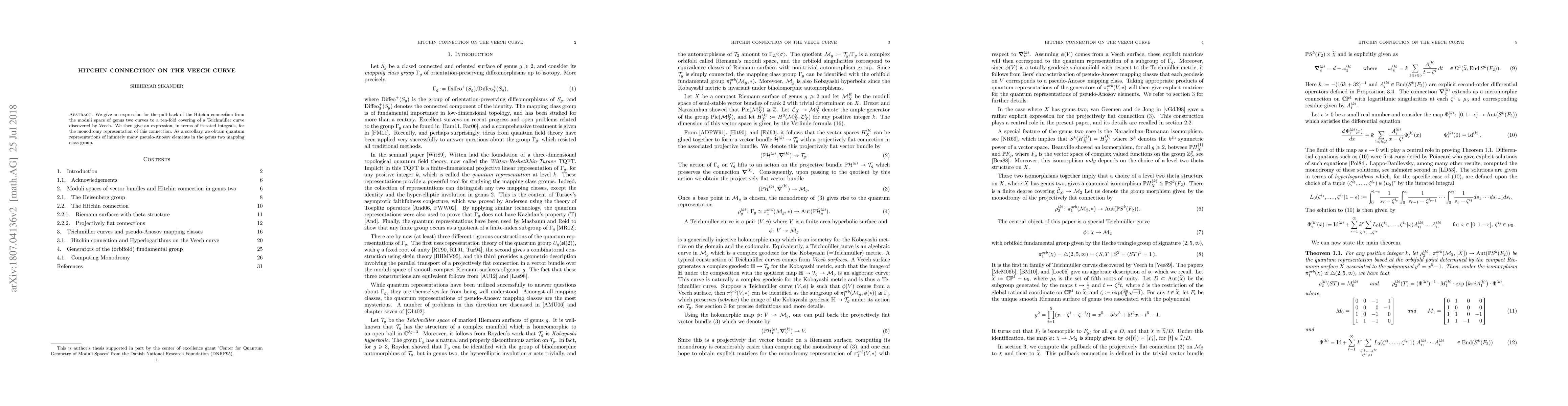This paper derives the Hitchin connection from the moduli space of genus two curves to a Veech curve's ten-fold covering, expressing its monodromy via iterated integrals. The result includes quantum representations of numerous pseudo-Anosov elements in the genus two mapping class group.