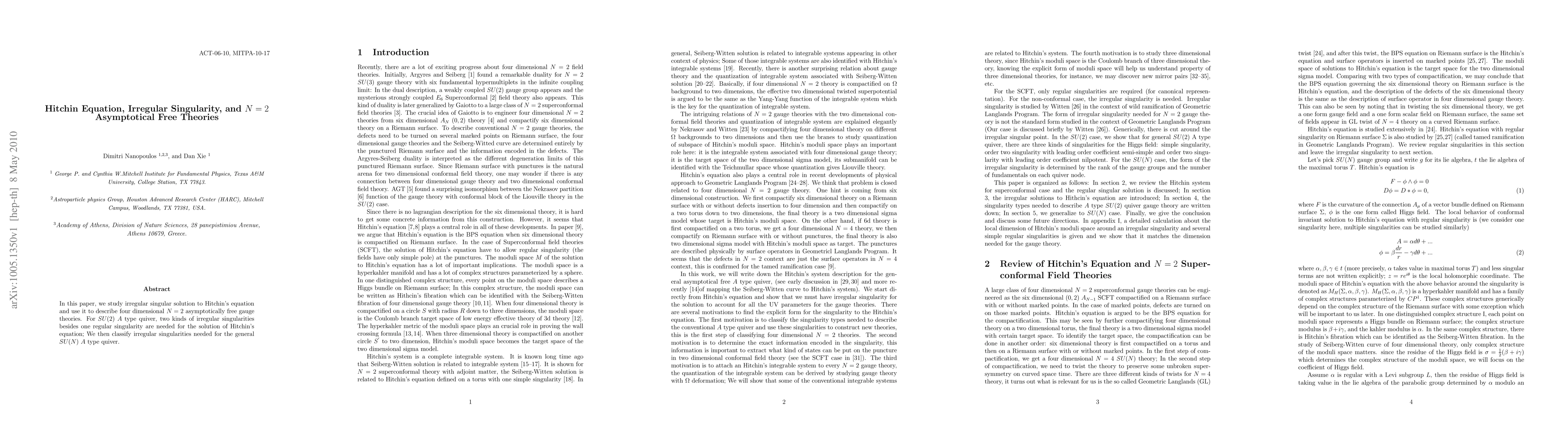 This paper investigates irregular singular solutions to Hitchin's equation to describe four-dimensional $N=2$ asymptotically free gauge theories. It identifies two types of irregular singularities, besides one regular singularity, for the $SU(2) A$ type quiver solution and classifies these singularities for general $SU(N) A$ type quivers.