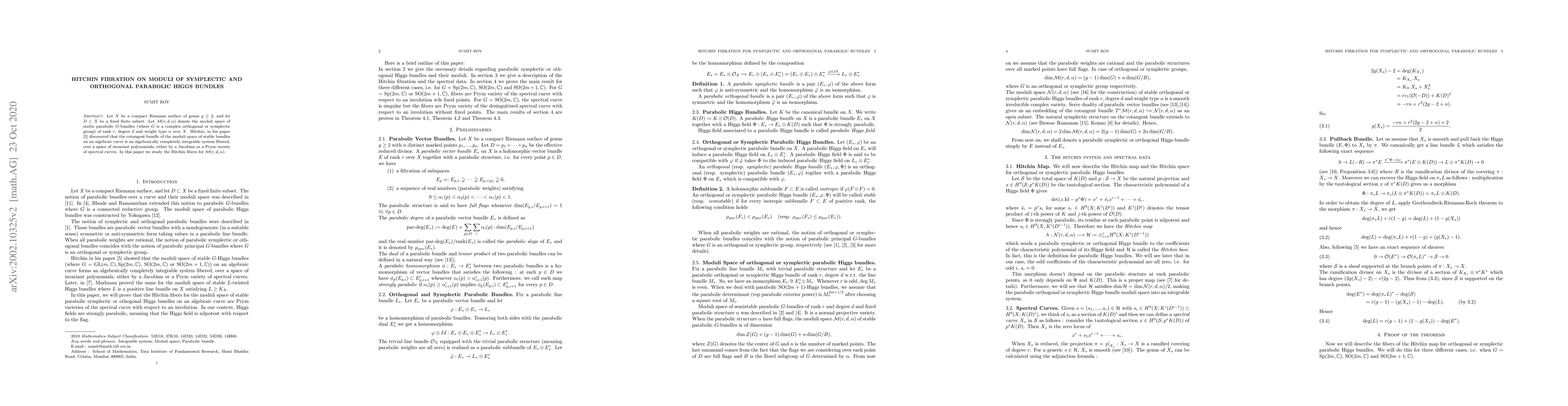 Let $X$ be a compact Riemann surface of genus $g \geq 2$, and let $D \subset X$ be a fixed finite subset. Let $\mathcal{M}(r,d,\alpha)$ denote the moduli space of stable parabolic $G$-bundles (where $G$ is a complex orthogonal or symplectic group) of rank $r$, degree $d$ and weight type $\alpha$ over $X$. Hitchin discovered that the cotangent bundle of the moduli space of stable bundles on an algebraic curve is an algebraically completely integrable system fibered, over a space of invariant polynomials, either by a Jacobian or a Prym variety of spectral curves. In this paper we study the Hitchin fibers for $\mathcal{M}(r,d,\alpha)$.