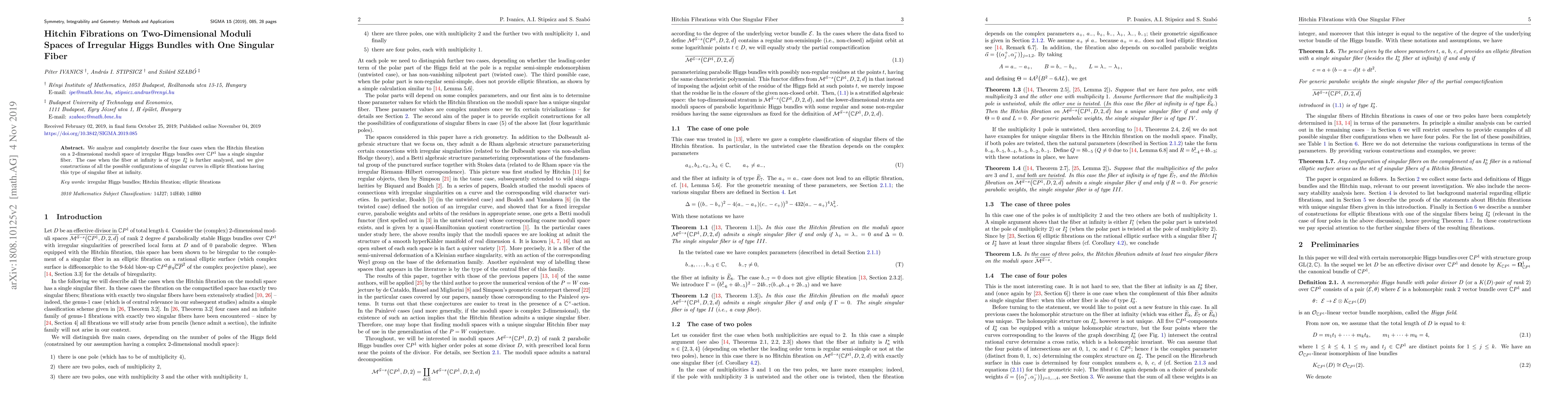 This paper analyzes four scenarios where a Hitchin fibration on a two-dimensional moduli space of irregular Higgs bundles over $\mathbb{C}P^{1}$ has a single singular fiber, with special focus on the $I_0^*$ type fiber at infinity and detailed constructions of associated singular curves in elliptic fibrations.