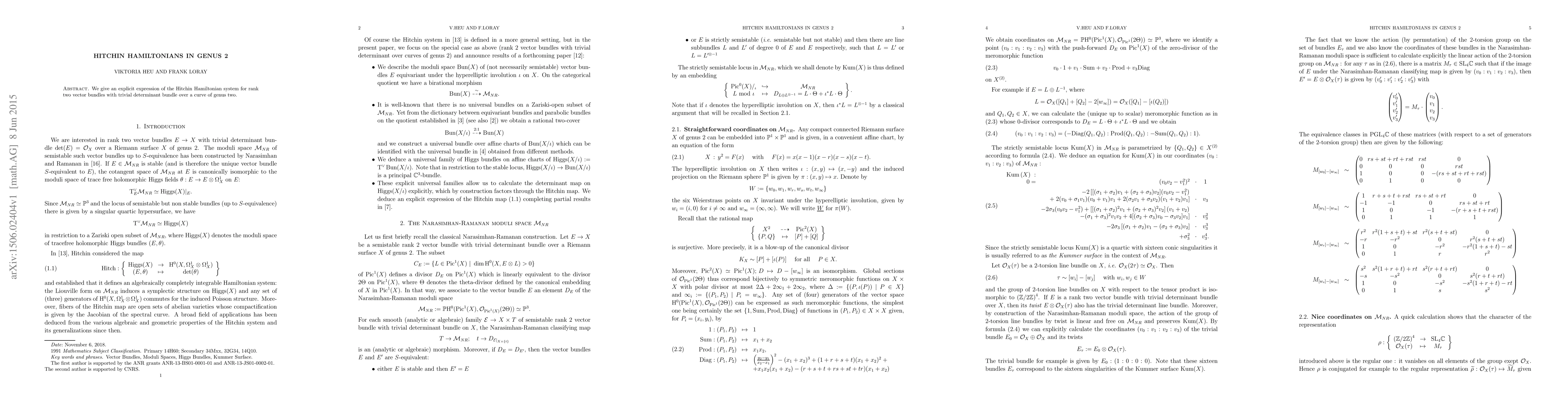 We give an explicit expression of the Hitchin Hamiltonian system for rank two vector bundles with trivial determinant bundle over a curve of genus two.