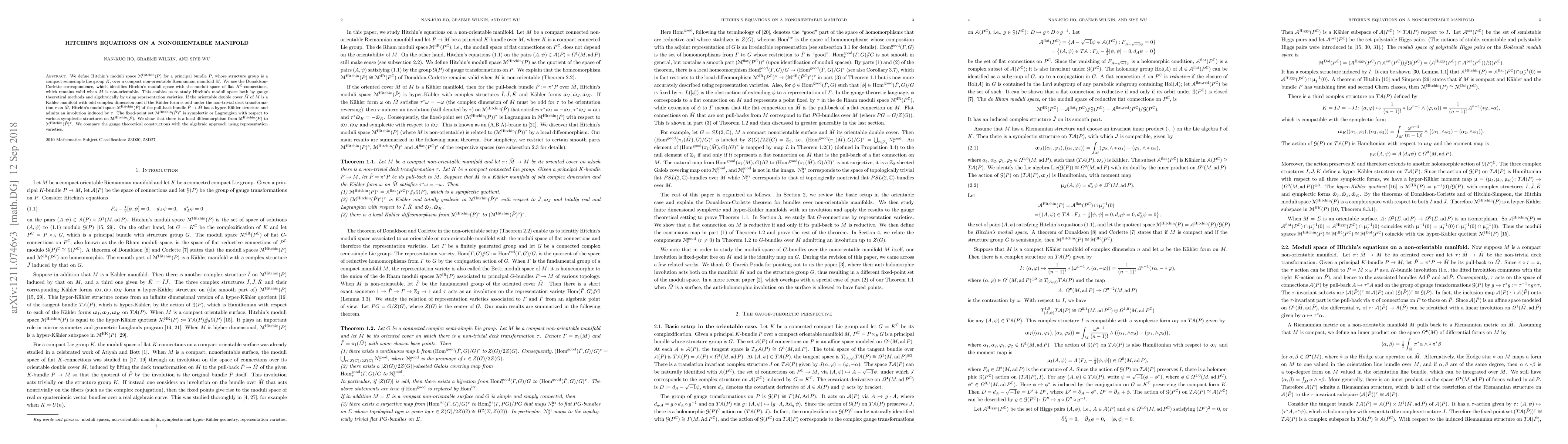 We define Hitchin's moduli space for a principal bundle $P$, whose structure group is a compact semisimple Lie group $K$, over a compact non-orientable Riemannian manifold $M$. We use the Donaldson-Corlette correspondence, which identifies Hitchin's moduli space with the moduli space of flat $K^\mathbb{C}$-connections, which remains valid when M is non-orientable. This enables us to study Hitchin's moduli space both by gauge theoretical methods and algebraically by using representation varieties. If the orientable double cover $\tilde{M}$ of $M$ is a K\"ahler manifold with odd complex dimension and if the K\"ahler form is odd under the non-trivial deck transformation on $\tilde{M}$, Hitchin's moduli space of the pull-back bundle $\tilde{P}$ over $\tilde{M}$ has a hyper-K\"ahler structure and admits an involution induced by the deck transformation. The fixed-point set is symplectic or Lagrangian with respect to various symplectic structures on Hitchin's moduli space over $\tilde{M}$. We show that there is a local diffeomorphism from Hitchin's moduli space over (the nonorientable manifold) $M$ to the fixed point set of the Hitchin's moduli space over (its orientable double cover) $\tilde{M}$. We compare the gauge theoretical constructions with the algebraic approach using representation varieties.