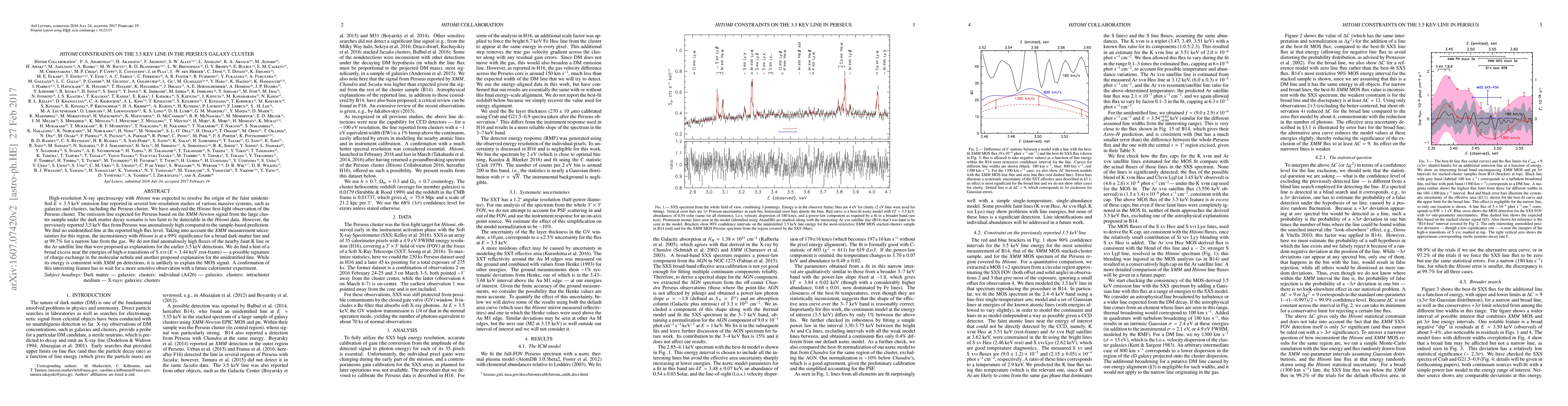The Hitomi observation of the Perseus galaxy cluster found no evidence for a previously reported 3.5 keV emission line at the high flux level, ruling out a broad dark-matter line with 99% significance and a narrow gas line with 99.7% significance. A hint of a broad excess near 3.44 keV suggests charge exchange in the molecular nebula, but it cannot explain the MOS signal.