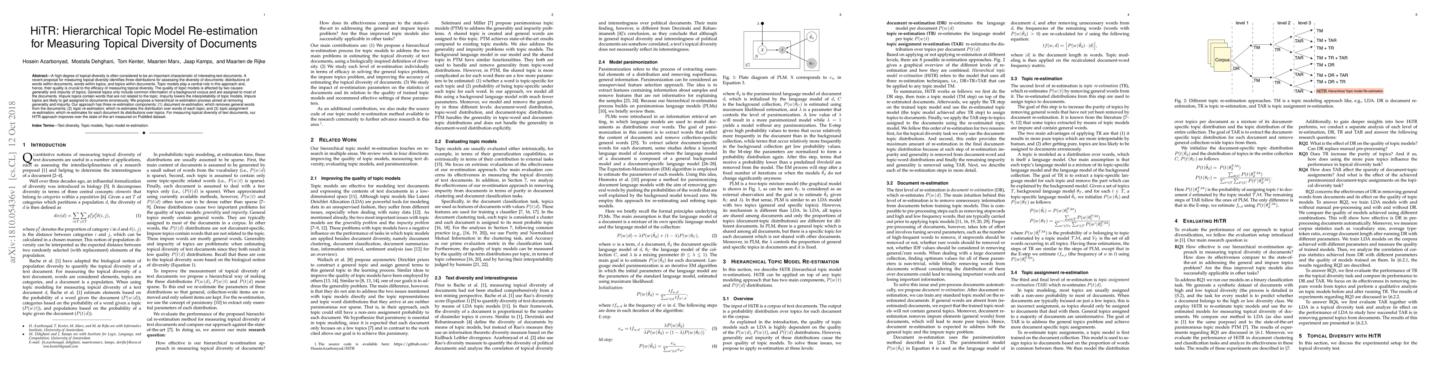 A high degree of topical diversity is often considered to be an important characteristic of interesting text documents. A recent proposal for measuring topical diversity identifies three distributions for assessing the diversity of documents: distributions of words within documents, words within topics, and topics within documents. Topic models play a central role in this approach and, hence, their quality is crucial to the efficacy of measuring topical diversity. The quality of topic models is affected by two causes: generality and impurity of topics. General topics only include common information of a background corpus and are assigned to most of the documents. Impure topics contain words that are not related to the topic. Impurity lowers the interpretability of topic models. Impure topics are likely to get assigned to documents erroneously. We propose a hierarchical re-estimation process aimed at removing generality and impurity. Our approach has three re-estimation components: (1) document re-estimation, which removes general words from the documents; (2) topic re-estimation, which re-estimates the distribution over words of each topic; and (3) topic assignment re-estimation, which re-estimates for each document its distributions over topics. For measuring topical diversity of text documents, our HiTR approach improves over the state-of-the-art measured on PubMed dataset.