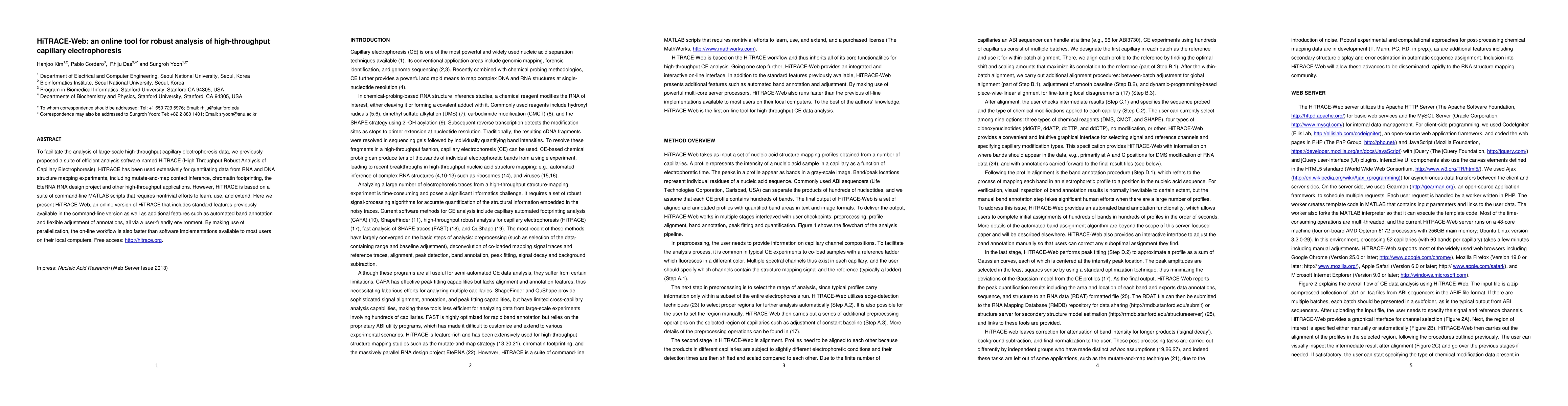 HiTRACE-Web is an online tool that simplifies the analysis of high-throughput capillary electrophoresis data, offering automated band annotation and flexible adjustment features in a user-friendly interface. It provides faster processing through parallelization compared to traditional command-line MATLAB scripts.
