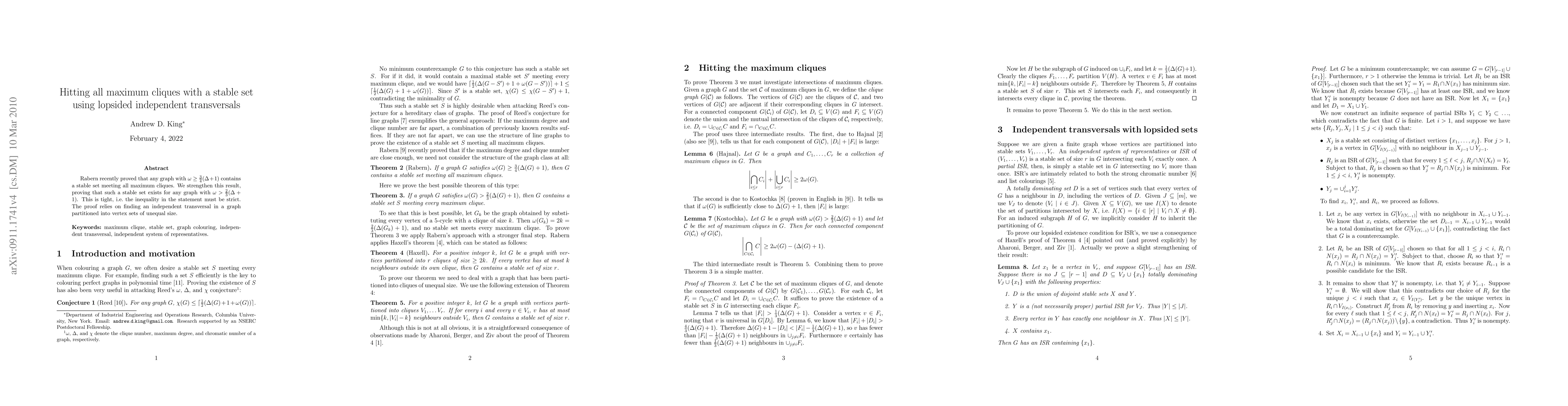 Rabern recently proved that any graph with omega >= (3/4)(Delta+1) contains a stable set meeting all maximum cliques. We strengthen this result, proving that such a stable set exists for any graph with omega > (2/3)(Delta+1). This is tight, i.e. the inequality in the statement must be strict. The proof relies on finding an independent transversal in a graph partitioned into vertex sets of unequal size.