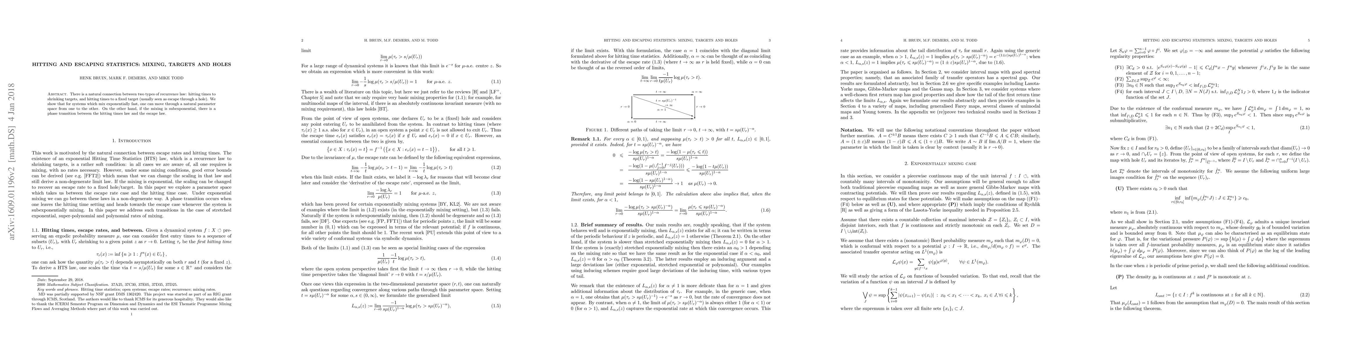 There is a natural connection between two types of recurrence law: hitting times to shrinking targets, and hitting times to a fixed target (usually seen as escape through a hole). We show that for systems which mix exponentially fast, one can move through a natural parameter space from one to the other. On the other hand, if the mixing is subexponential, there is a phase transition between the hitting times law and the escape law.