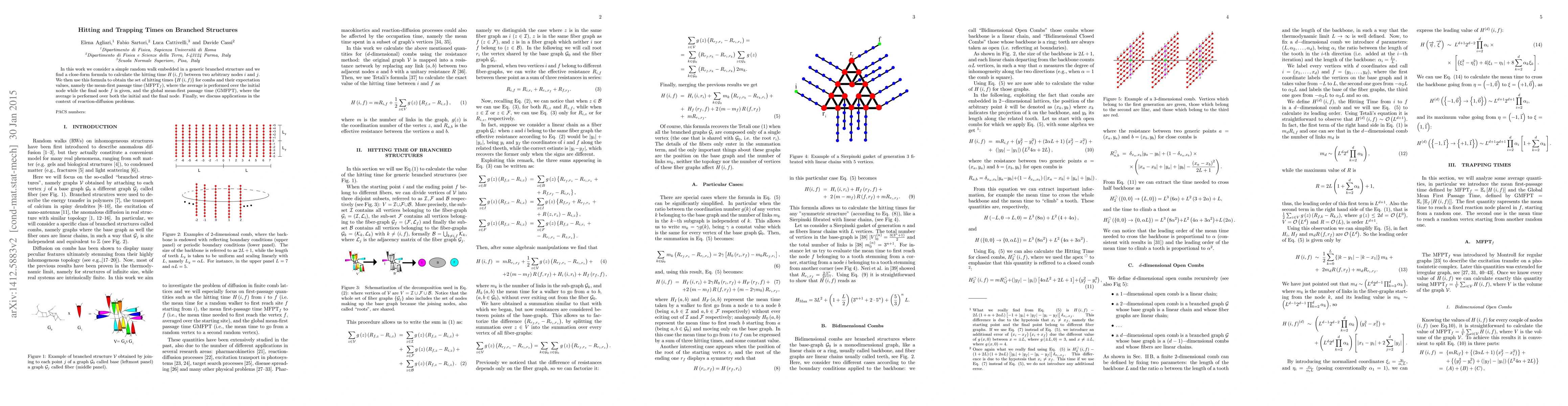 In this work we consider a simple random walk embedded in a generic branched structure and we find a close-form formula to calculate the hitting time $H\left(i,f\right)$ between two arbitrary nodes $i$ and $j$. We then use this formula to obtain the set of hitting times $\left\{ H\left(i,f\right)\right\} $ for combs and their expectation values, namely the mean-first passage time $\left( \mbox{MFPT}_{f} \right)$, where the average is performed over the initial node while the final node $f$ is given, and the global mean-first passage time $\left( \mbox{GMFPT} \right)$, where the average is performed over both the initial and the final node. Finally, we discuss applications in the context of reaction-diffusion problems.