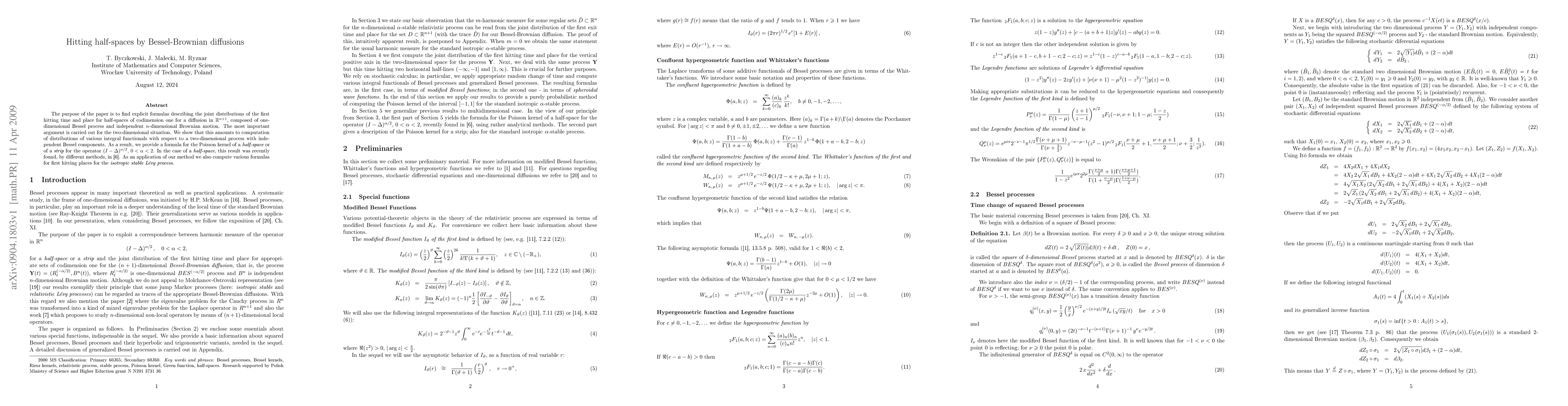 The purpose of the paper is to find explicit formulas describing the joint distributions of the first hitting time and place for half-spaces of codimension one for a diffusion in $\R^{n+1}$, composed of one-dimensional Bessel process and independent n-dimensional Brownian motion. The most important argument is carried out for the two-dimensional situation. We show that this amounts to computation of distributions of various integral functionals with respect to a two-dimensional process with independent Bessel components. As a result, we provide a formula for the Poisson kernel of a half-space or of a strip for the operator $(I-\Delta)^{\alpha/2}$, $0<\alpha<2$. In the case of a half-space, this result was recently found, by different methods, in [6]. As an application of our method we also compute various formulas for first hitting places for the isotropic stable L\'evy process.