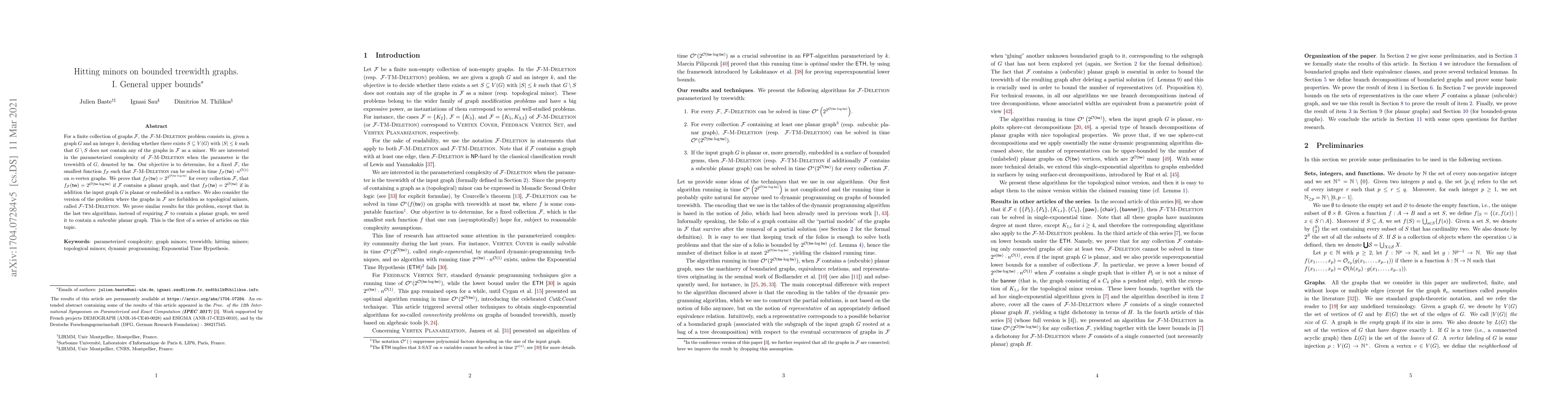 Researchers prove that the time complexity of determining if a graph can be made minor-free from a collection of graphs is bounded by 2^O(tw * log tw), with similar results for specific cases involving planar graphs or surface embeddings.
