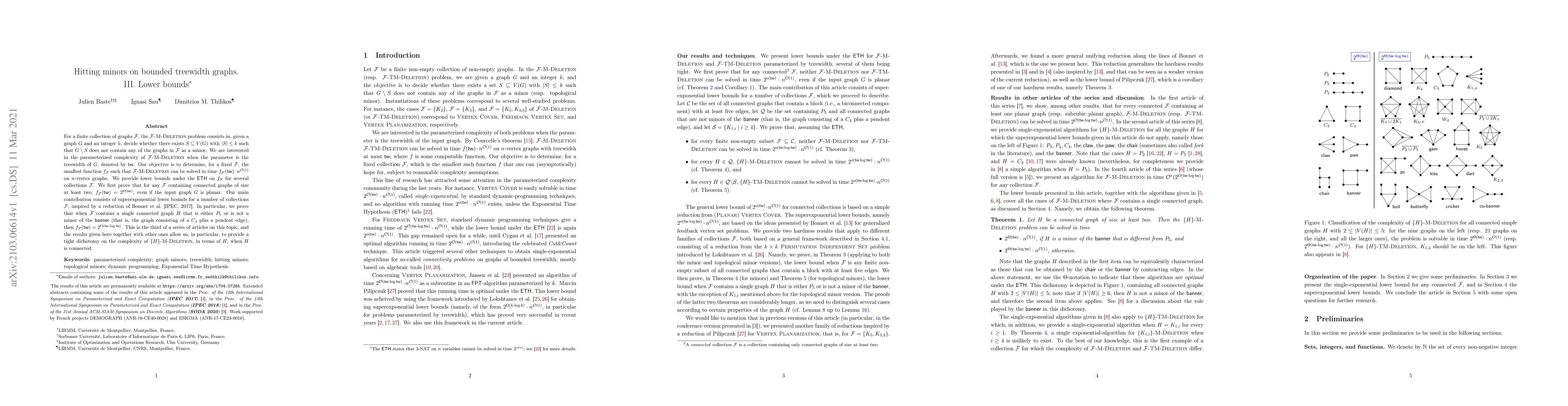 For a finite collection of graphs ${\cal F}$, the ${\cal F}$-M-DELETION problem consists in, given a graph $G$ and an integer $k$, decide whether there exists $S \subseteq V(G)$ with $|S| \leq k$ such that $G \setminus S$ does not contain any of the graphs in ${\cal F}$ as a minor. We are interested in the parameterized complexity of ${\cal F}$-M-DELETION when the parameter is the treewidth of $G$, denoted by $tw$. Our objective is to determine, for a fixed ${\cal F}$, the smallest function $f_{{\cal F}}$ such that ${\cal F}$-M-DELETION can be solved in time $f_{{\cal F}}(tw) \cdot n^{O(1)}$ on $n$-vertex graphs. We provide lower bounds under the ETH on $f_{{\cal F}}$ for several collections ${\cal F}$. We first prove that for any ${\cal F}$ containing connected graphs of size at least two, $f_{{\cal F}}(tw)= 2^{\Omega(tw)}$, even if the input graph $G$ is planar. Our main contribution consists of superexponential lower bounds for a number of collections ${\cal F}$, inspired by a reduction of Bonnet et al.~[IPEC, 2017]. In particular, we prove that when ${\cal F}$ contains a single connected graph $H$ that is either $P_5$ or is not a minor of the banner (that is, the graph consisting of a $C_4$ plus a pendent edge), then $f_{{\cal F}}(tw)= 2^{\Omega(tw \cdot \log tw)}$. This is the third of a series of articles on this topic, and the results given here together with other ones allow us, in particular, to provide a tight dichotomy on the complexity of $\{H\}$-M-DELETION, in terms of $H$, when $H$ is connected.