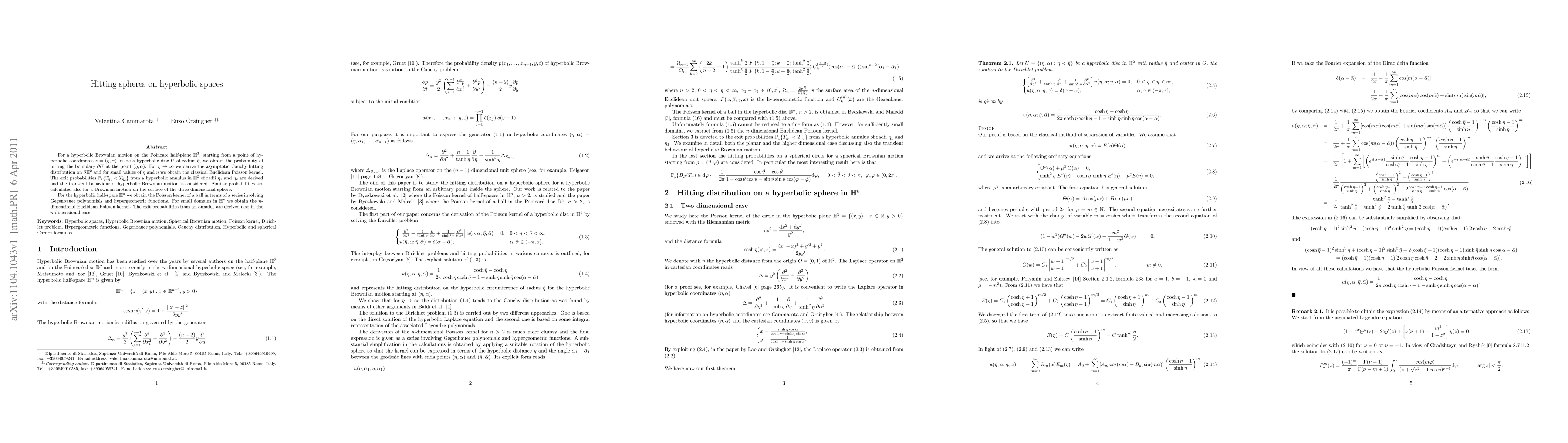 This paper investigates the hitting probabilities and exit dynamics of hyperbolic Brownian motion in both the hyperbolic plane $\mathbb{H}^2$ and higher-dimensional hyperbolic spaces $\mathbb{H}^n$. It derives the asymptotic Cauchy hitting distribution and classical Euclidean Poisson kernel for small and large radii, respectively.