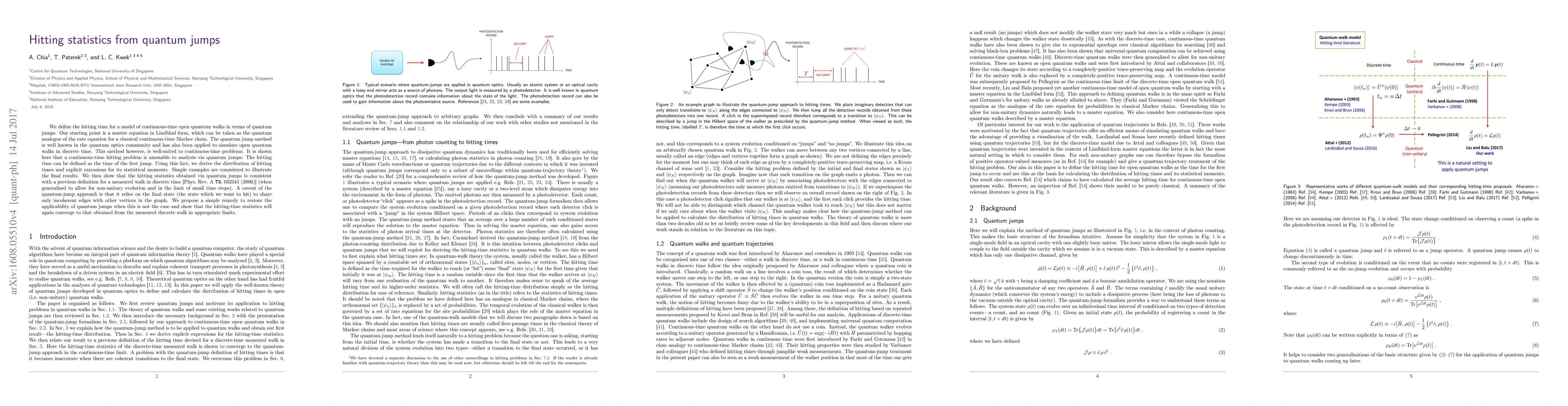 This paper defines the hitting time for continuous-time open quantum walks using quantum jumps and derives the distribution of hitting times and their statistical moments. It also addresses the limitation of quantum jumps when final states share coherent edges and proposes a solution to maintain applicability.