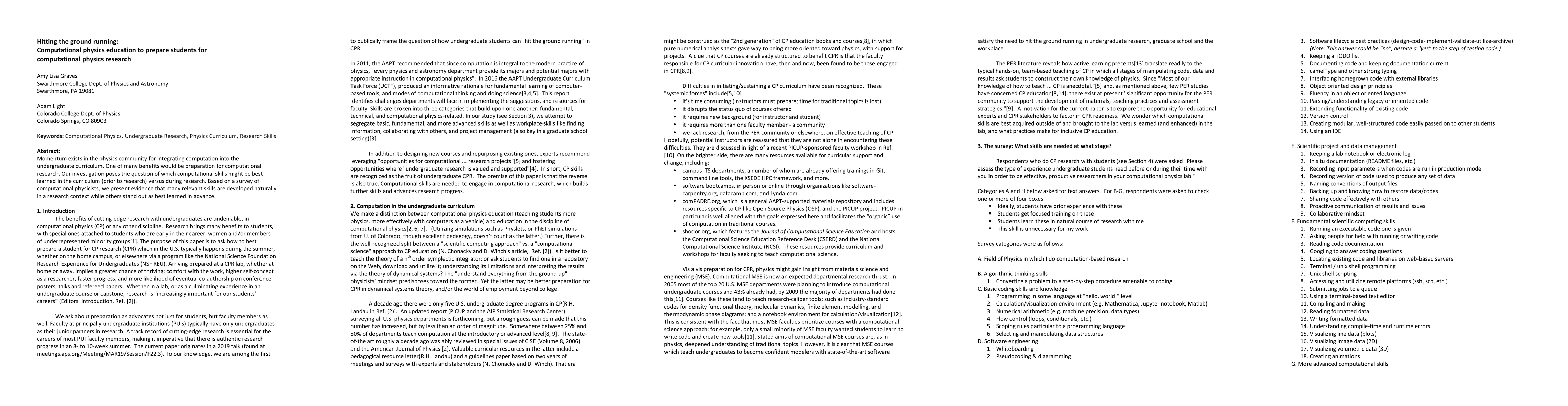 Momentum exists in the physics community for integrating computation into the undergraduate curriculum. One of many benefits would be preparation for computational research. Our investigation poses the question of which computational skills might be best learned in the curriculum (prior to research) versus during research. Based on a survey of computational physicists, we present evidence that many relevant skills are developed naturally in a research context while others stand out as best learned in advance.