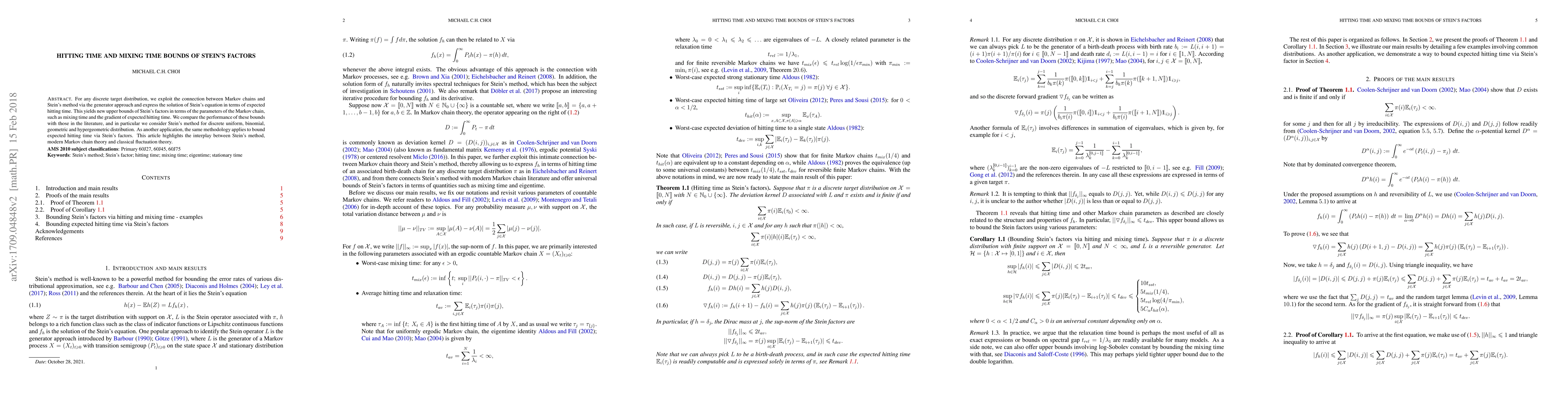 This paper uses Markov chain theory to derive new bounds for Stein's method, a statistical technique used to estimate distribution functions, in terms of mixing time and expected hitting time. The results provide improved performance for certain distributions, including discrete uniform, binomial, geometric, and hypergeometric distributions.