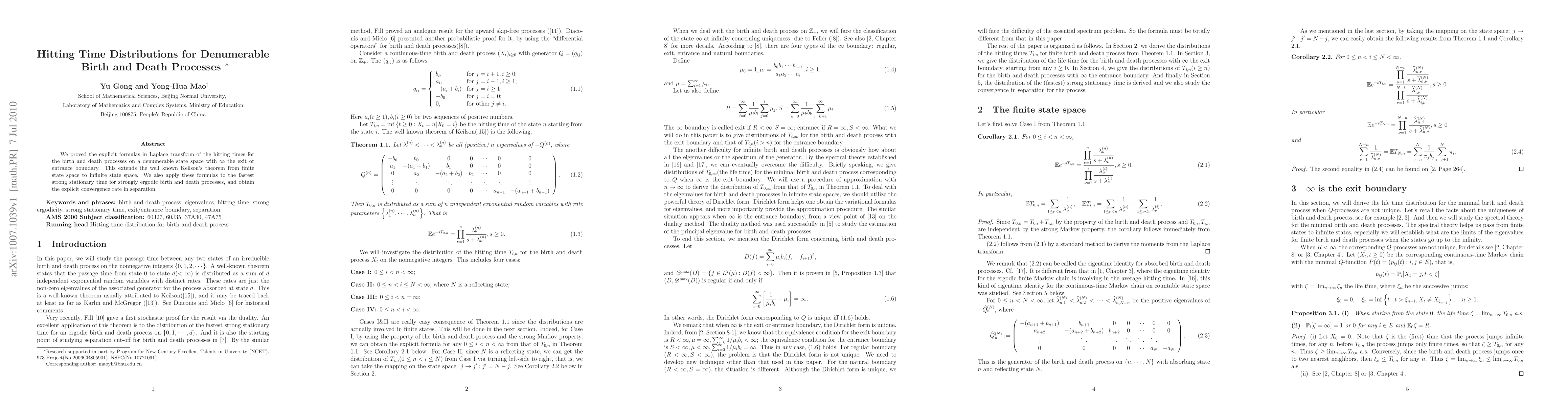 We proved the explicit formulas in Laplace transform of the hitting times for the birth and death processes on a denumerable state space with $\ift$ the exit or entrance boundary. This extends the well known Keilson's theorem from finite state space to infinite state space. We also apply these formulas to the fastest strong stationary time for strongly ergodic birth and death processes, and obtain the explicit convergence rate in separation.