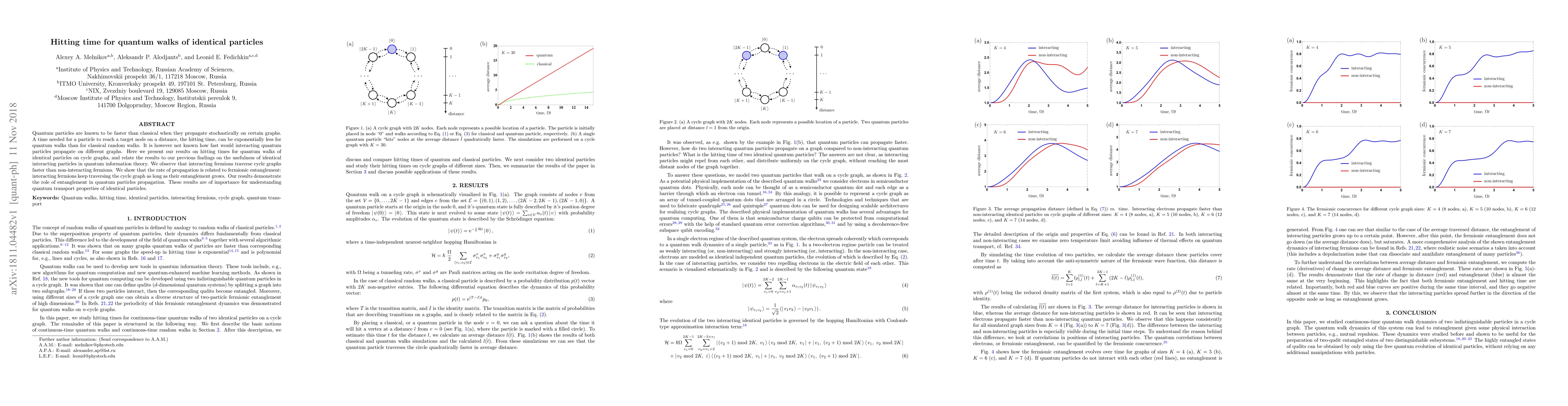 Quantum particles are known to be faster than classical when they propagate stochastically on certain graphs. A time needed for a particle to reach a target node on a distance, the hitting time, can be exponentially less for quantum walks than for classical random walks. It is however not known how fast would interacting quantum particles propagate on different graphs. Here we present our results on hitting times for quantum walks of identical particles on cycle graphs, and relate the results to our previous findings on the usefulness of identical interacting particles in quantum information theory. We observe that interacting fermions traverse cycle graphs faster than non-interacting fermions. We show that the rate of propagation is related to fermionic entanglement: interacting fermions keep traversing the cycle graph as long as their entanglement grows. Our results demonstrate the role of entanglement in quantum particles propagation. These results are of importance for understanding quantum transport properties of identical particles.