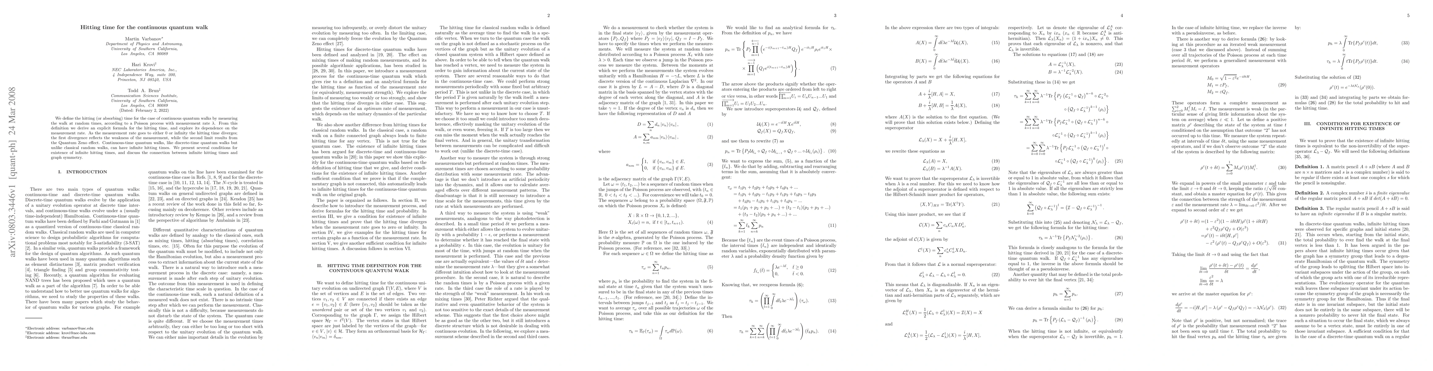This paper defines the hitting time for continuous quantum walks, deriving an explicit formula that depends on the measurement rate. It explores how the hitting time diverges as the measurement rate approaches 0 or infinity, highlighting the Quantum Zeno effect and conditions for infinite hitting times linked to graph symmetry.