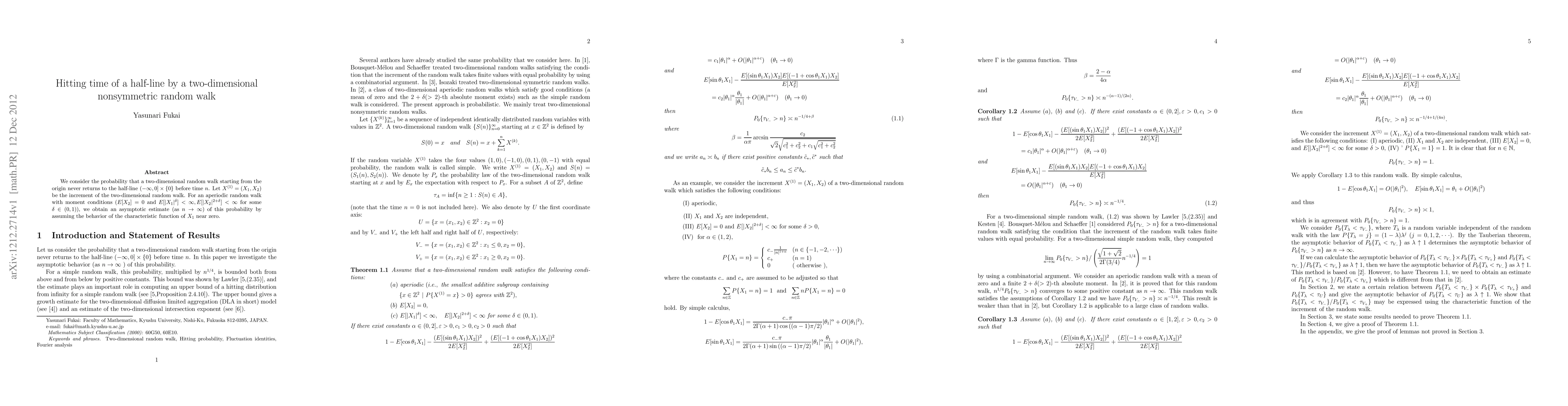 This paper studies the hitting time of a half-line by a two-dimensional nonsymmetric random walk starting from the origin, focusing on the probability that the walk never returns to the negative half-line before time $n$. It provides an asymptotic estimate of this probability under moment conditions for an aperiodic random walk.