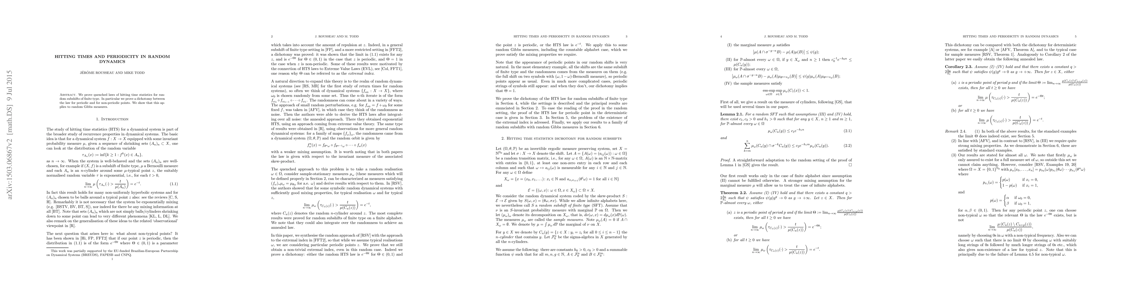 We prove quenched laws of hitting time statistics for random subshifts of finite type. In particular we prove a dichotomy between the law for periodic and for non-periodic points. We show that this applies to random Gibbs measures.
