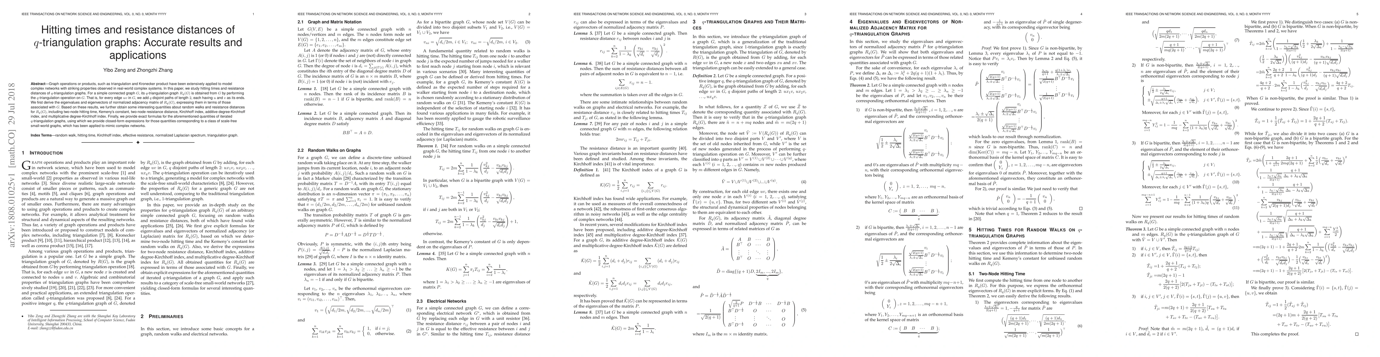 This paper investigates hitting times and resistance distances in $q$-triangulation graphs, deriving eigenvalues and eigenvectors of their normalized adjacency matrices in terms of those of the original graph. It provides exact formulas for various quantities related to random walks and resistance distances, and applies these results to scale-free small-world graphs.