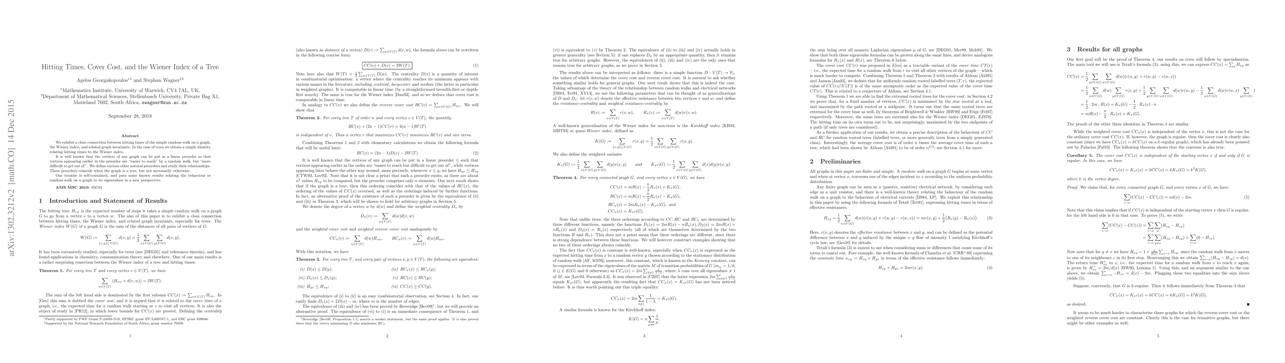 We exhibit a close connection between hitting times of the simple random walk on a graph, the Wiener index, and related graph invariants. In the case of trees we obtain a simple identity relating hitting times to the Wiener index. It is well known that the vertices of any graph can be put in a linear preorder so that vertices appearing earlier in the preorder are "easier to reach" by a random walk, but "more difficult to get out of". We define various other natural preorders and study their relationships. These preorders coincide when the graph is a tree, but not necessarily otherwise. Our treatise is self-contained, and puts some known results relating the behaviour or random walk on a graph to its eigenvalues in a new perspective.