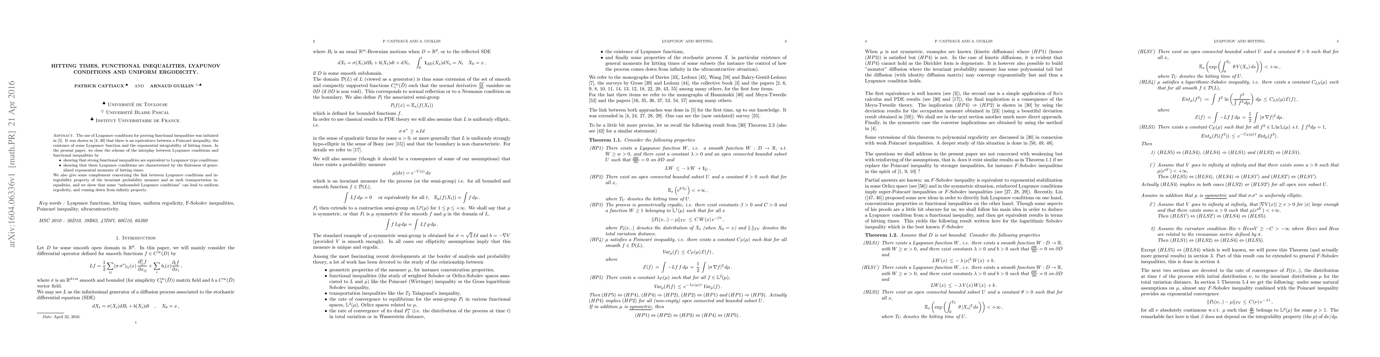 This paper explores the relationship between Lyapunov conditions and functional inequalities, demonstrating that strong functional inequalities are equivalent to Lyapunov type conditions. It also shows that these conditions are characterized by the finiteness of generalized exponential moments of hitting times, and discusses the link to uniform ergodicity and transportation inequalities.