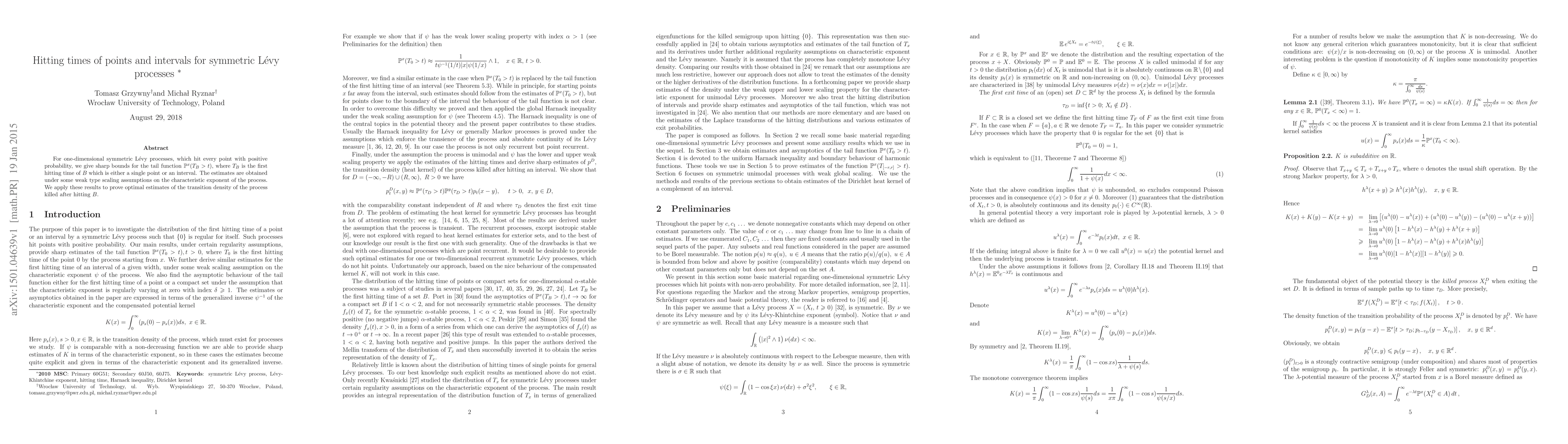 For one-dimensional symmetric L\'{e}vy processes, which hit every point with positive probability, we give sharp bounds for the tail function of the first hitting time of B which is either a single point or an interval. The estimates are obtained under some weak type scaling assumptions on the characteristic exponent of the process. We apply these results to prove optimal estimates of the transition density of the process killed after hitting B.
