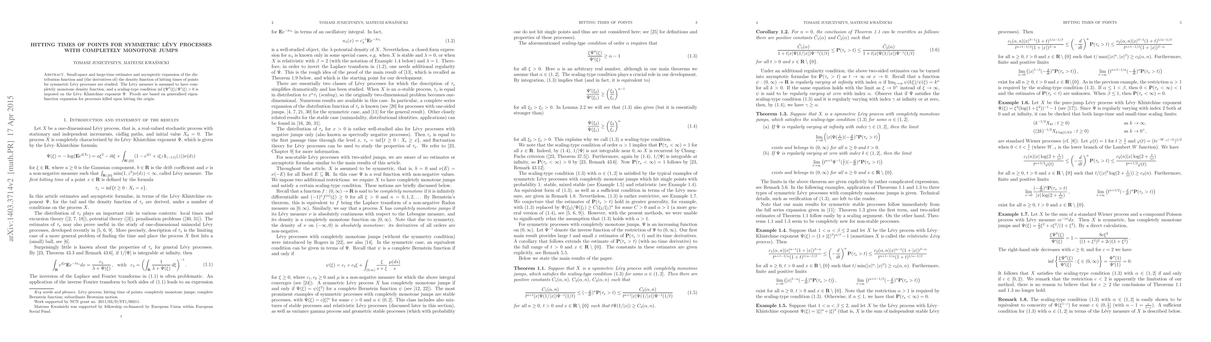 This paper investigates the hitting times of points for symmetric Lévy processes with completely monotone jumps, providing small-space and large-time estimates and an asymptotic expansion of the distribution and density functions. The Lévy measure's density function is assumed completely monotone, and a scaling-type condition is imposed on the Lévy-Khintchine exponent.