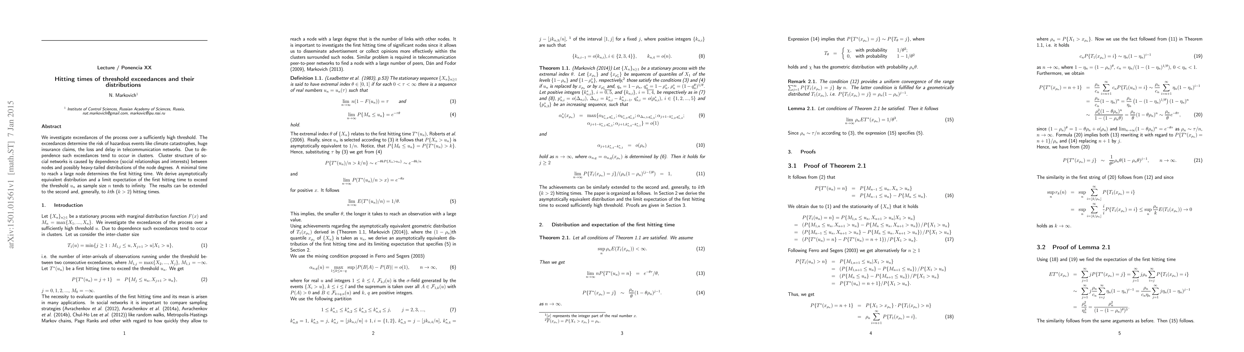 This paper examines the distribution of hitting times for exceedances over a high threshold, crucial for assessing risks in areas like climate catastrophes and insurance claims. It derives the asymptotic distribution and expectation for the first hitting time, extending these results to higher-order hitting times, and discusses the implications of dependence and clustering in processes.