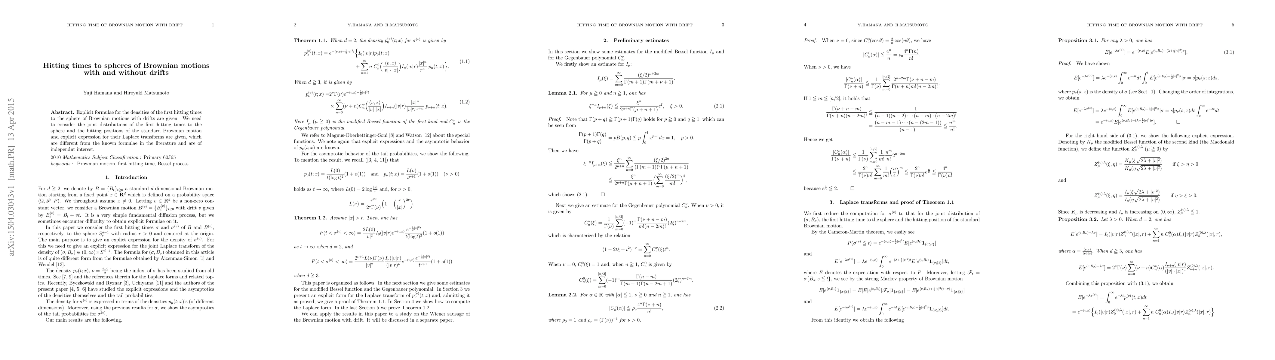 This paper presents new explicit formulae for the densities of first hitting times to a sphere in Brownian motions with drifts, along with joint distributions of hitting times and positions. The derived Laplace transforms differ from existing literature and hold independent significance.