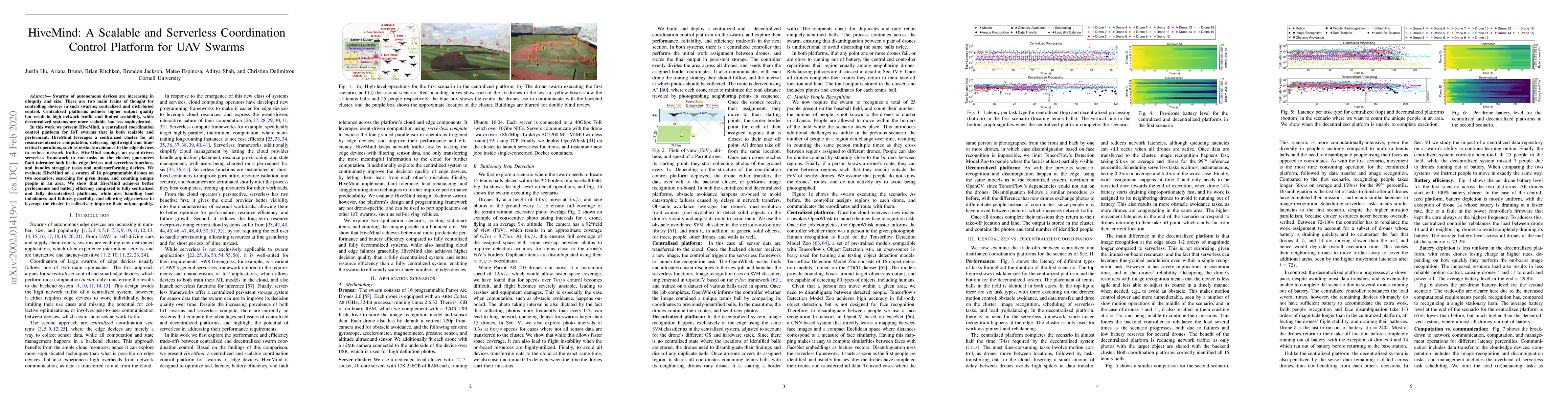 HiveMind is a scalable, serverless coordination control platform for UAV swarms that combines centralized computation with edge-based lightweight operations, achieving better performance and battery efficiency compared to fully centralized or decentralized systems. It effectively manages load imbalances and failures while leveraging a cluster for resource-intensive tasks.