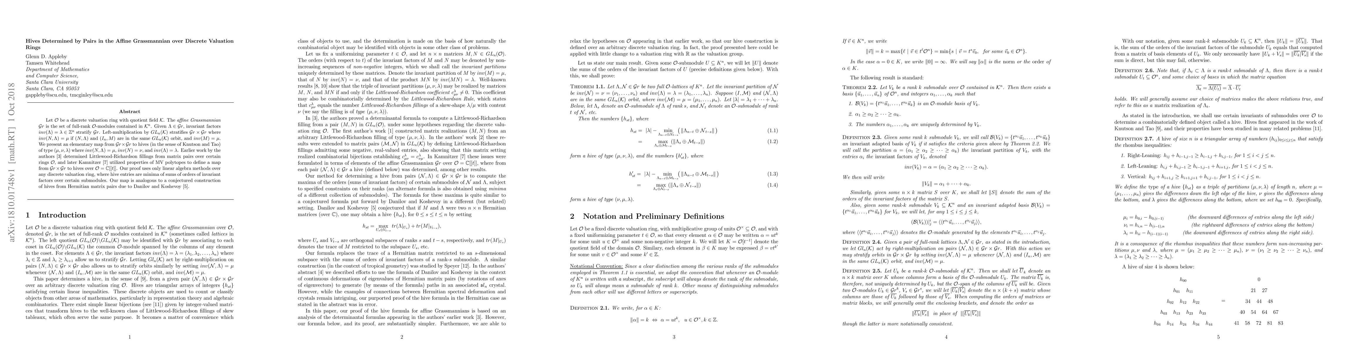 Let ${\mathcal O}$ be a discrete valuation ring with quotient field ${\cal K}$. The affine Grassmannian ${\cal G}r$ is the set of full-rank ${\mathcal O}$-modules contained in ${\cal K}^n$. Given $\Lambda \in {\cal G}r$, invariant factors $inv(\Lambda)=\lambda \in {\mathbb Z}^n$ stratify ${\cal G}r$. Left-multiplication by $GL_{n}({\cal K})$ stratifies ${\cal G}r \times {\cal G}r$ where $inv(N,\Lambda) = \mu$ if $(N,\Lambda)$ and $(I_{n} ,M)$ are in the same $GL_{n}({\cal K})$ orbit, and $inv(M) = \mu$. We present an elementary map from ${\cal G}r \times {\cal G}r$ to hives (in the sense of Knutson and Tao) of type $(\mu,\nu,\lambda)$ where $inv(N,\Lambda) = \mu$, $inv(N) = \nu$, and $inv(\Lambda) = \lambda$. Earlier work by the authors determined Littlewood-Richardson fillings from matrix pairs over certain rings ${\mathcal O}$, and later Kamnitzer utilized properties of MV polytopes to define a map from ${\cal G}r\times {\cal G}r$ to hives over ${\mathcal O} = {\mathbb C}[[t]]$. Our proof uses only linear algebra methods over any discrete valuation ring, where hive entries are minima of sums of orders of invariant factors over certain submodules. Our map is analogous to a conjectured construction of hives from Hermitian matrix pairs due to Danilov and Koshevoy.