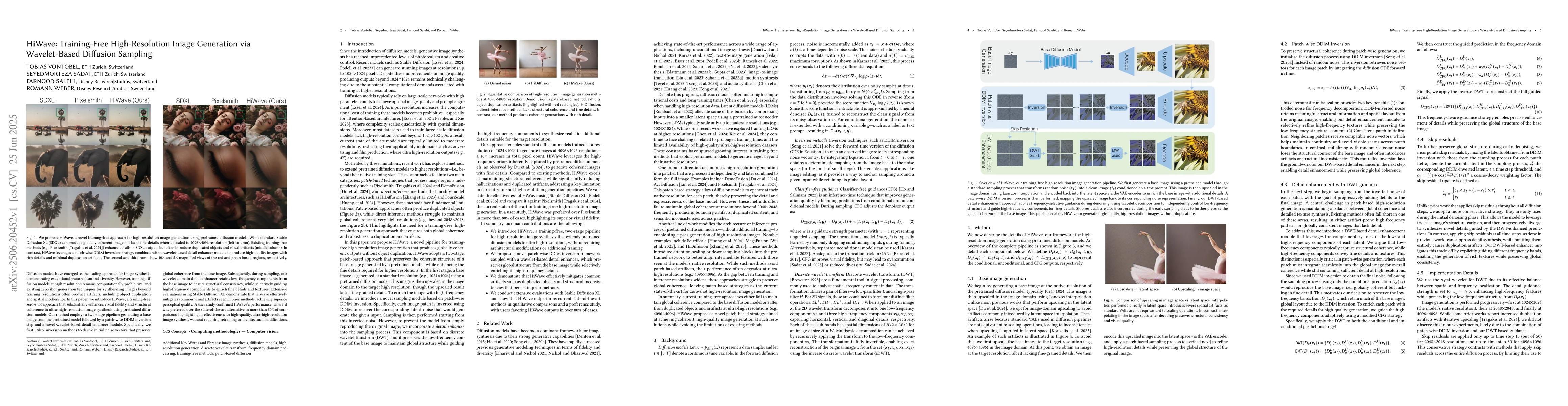 The paper introduces HiWave, a training-free method for high-resolution image synthesis using pretrained diffusion models. HiWave employs a two-stage pipeline involving inversion methods and a wavelet-based detail enhancer to produce images with superior perceptual quality, reducing artifacts like object duplication and spatial incoherence, as validated through extensive evaluations and user studies.