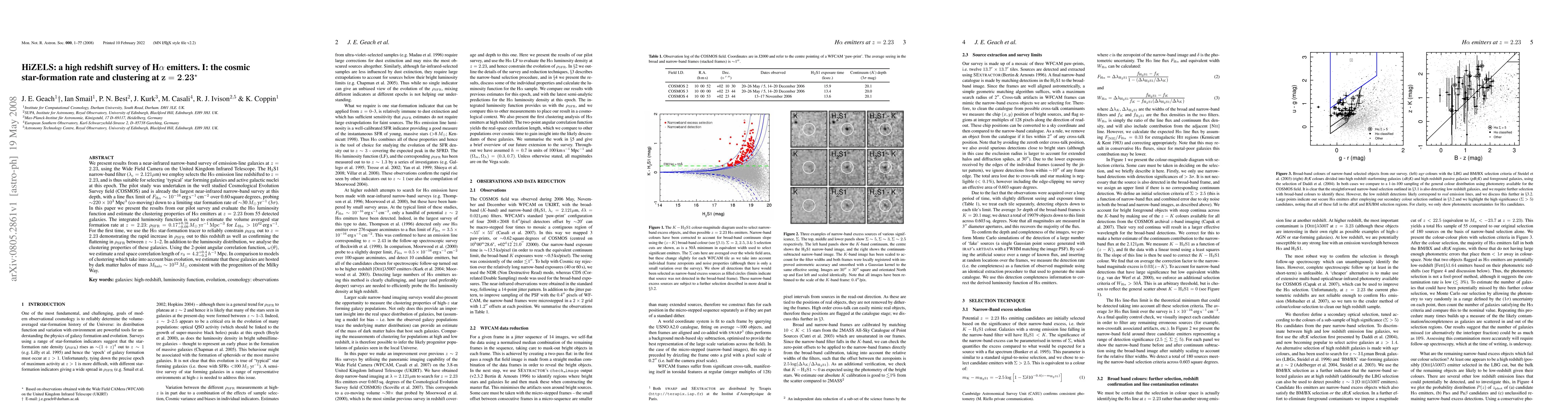 We present results from a near-infrared narrow-band survey of emission-line galaxies at z=2.23, using the Wide Field Camera on the United Kingdom Infrared Telescope. The H2S1 narrow-band filter (lambda_c=2.121um) we employ selects the H-alpha emission line redshifted to z=2.23, and is thus suitable for selecting 'typical' star forming galaxies and active galactic nuclei at this epoch. The pilot study was undertaken in the well studied Cosmological Evolution Survey field (COSMOS) and is already the largest near-infrared narrow-band survey at this depth, with a line flux limit of F(H-alpha)~10^-16 erg/s/cm^2 over 0.60 square degrees, probing ~220x10^3 Mpc^3 (co-moving) down to a limiting star formation rate of 30 M_sun/yr (3sigma). In this paper we present the results from our pilot survey and evaluate the H-alpha luminosity function and estimate the clustering properties of H-alpha emitters at z=2.23 from 55 detected galaxies. The integrated luminosity function is used to estimate the volume averaged star formation rate at z=2.23: SFRD = 0.17^{+0.16}_{-0.09} M_sun/yr/Mpc^3 for L(H-alpha) > 10^42 erg/s. For the first time, we use the H-alpha star-formation tracer to reliably constrain SFRD out to z=2.23 demonstrating the rapid increase in SRFD out to this redshift as well as confirming the flattening in SFRD between z~1-2. In addition to the luminosity distribution, we analyse the clustering properties of these galaxies. Using the 2-point angular correlation function, we estimate a real space correlation length of r_0= 4.2^{+0.4}_{-0.2} h^-1 Mpc. In comparison to models of clustering which take into account bias evolution, we estimate that these galaxies are hosted by dark matter halos of mass M_halo ~ 10^12 M_sun consistent with the progenitors of the Milky Way.