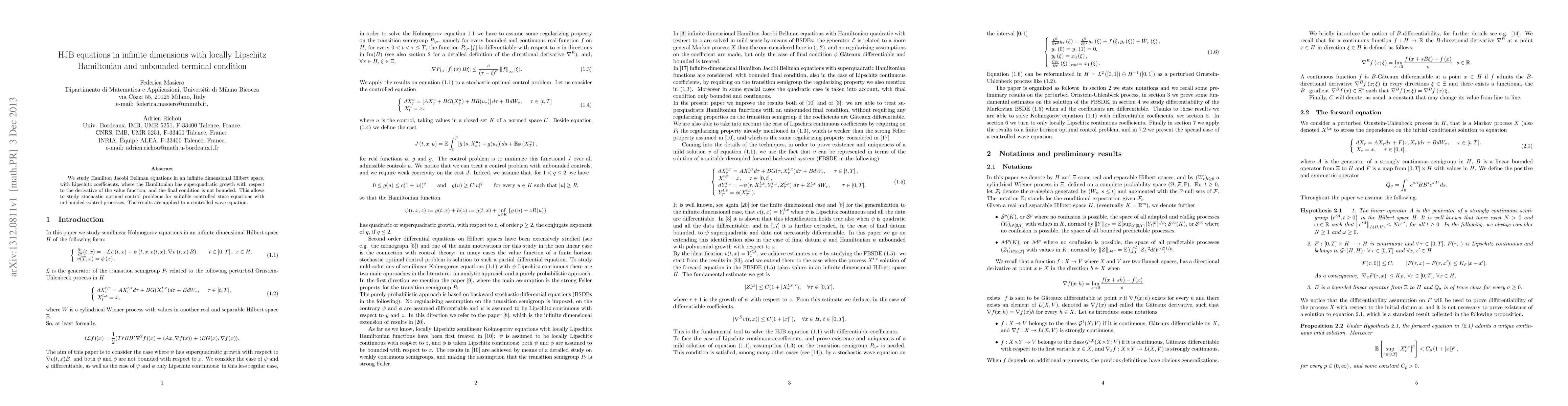 This paper investigates Hamilton Jacobi Bellman (HJB) equations in an infinite-dimensional Hilbert space with locally Lipschitz Hamiltonians and unbounded terminal conditions, focusing on the superquadratic growth of the Hamiltonian. The findings enable the study of stochastic optimal control problems for controlled state equations with unbounded control processes, exemplified by a controlled wave equation.